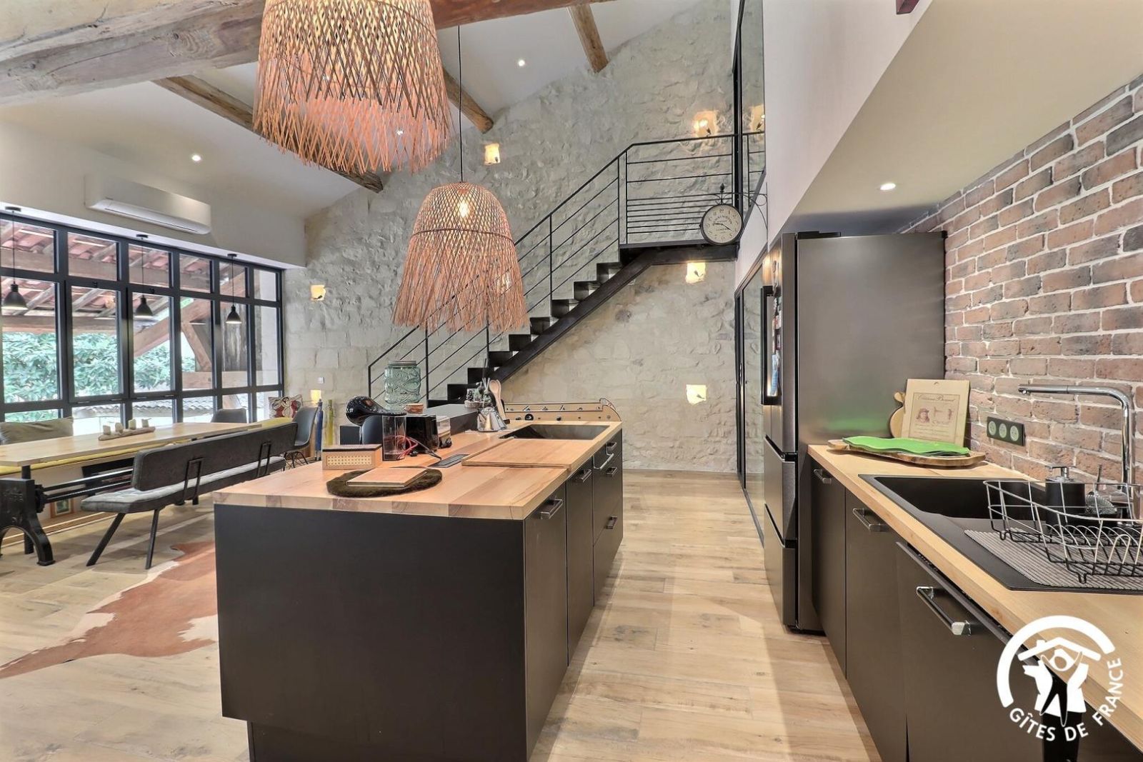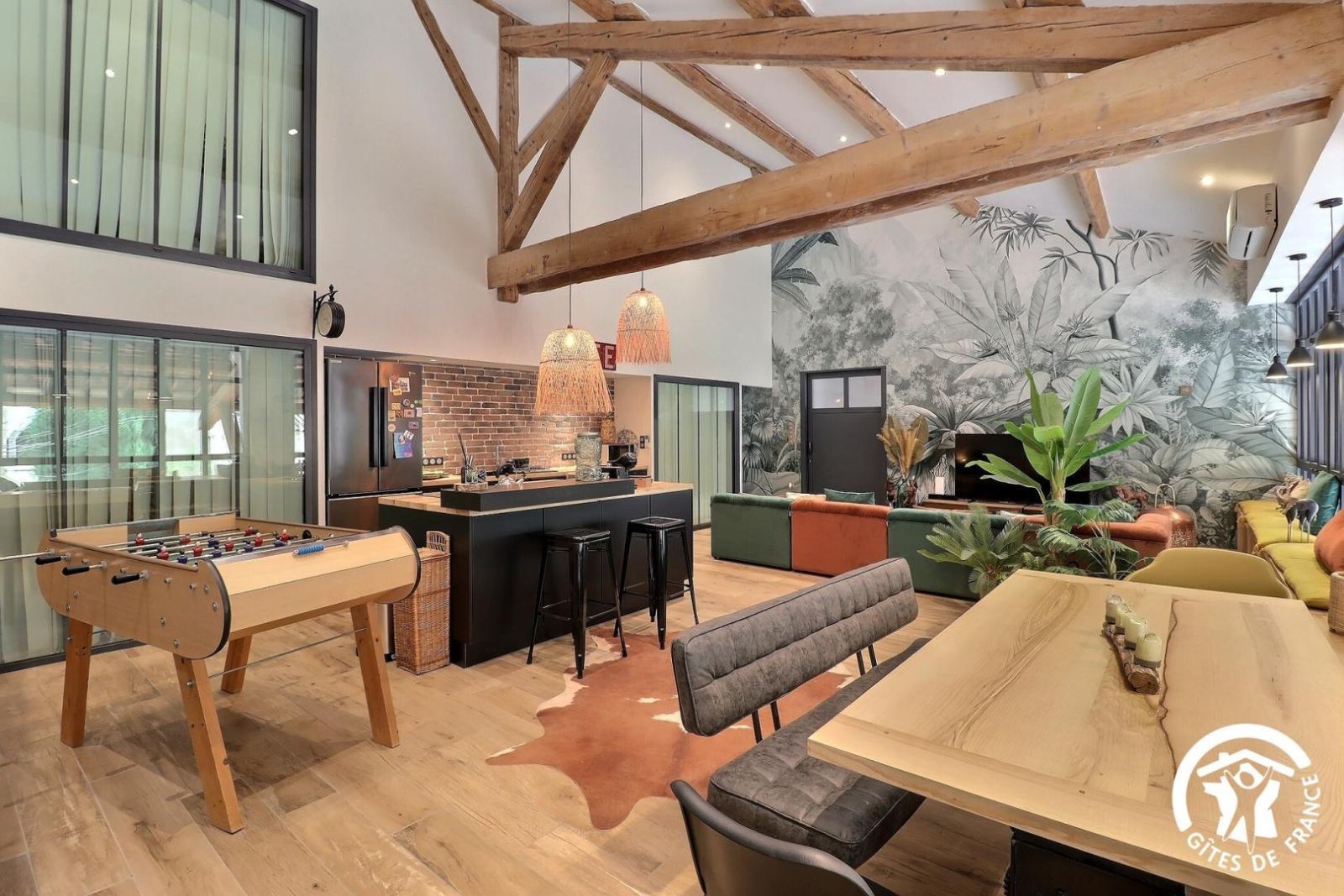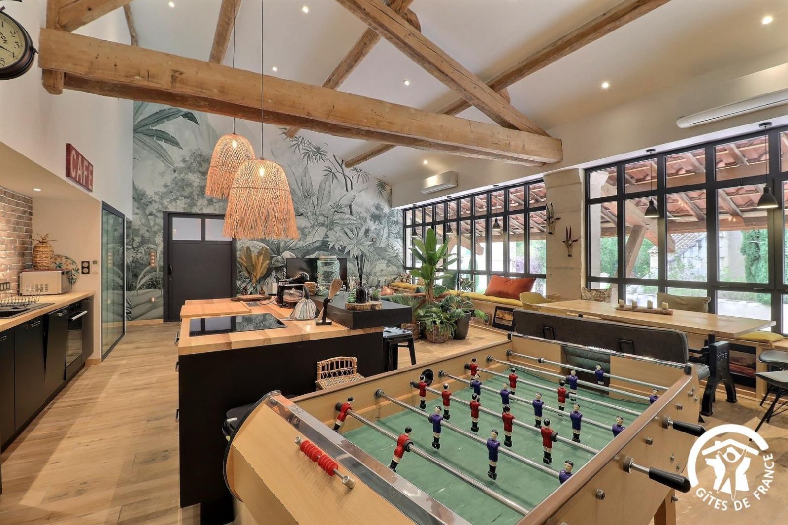 - Grande pièce de jour : cuisine équipée ouverte au milieu de la pièce, avec réfrigérateur/congélateur américain, four, micro-ondes, lave-vaisselle, 3 feux induction. Salon avec grand canapé d'angle, table basse, TV connectée. Table repas avec banquette et chaises. Babyfoot