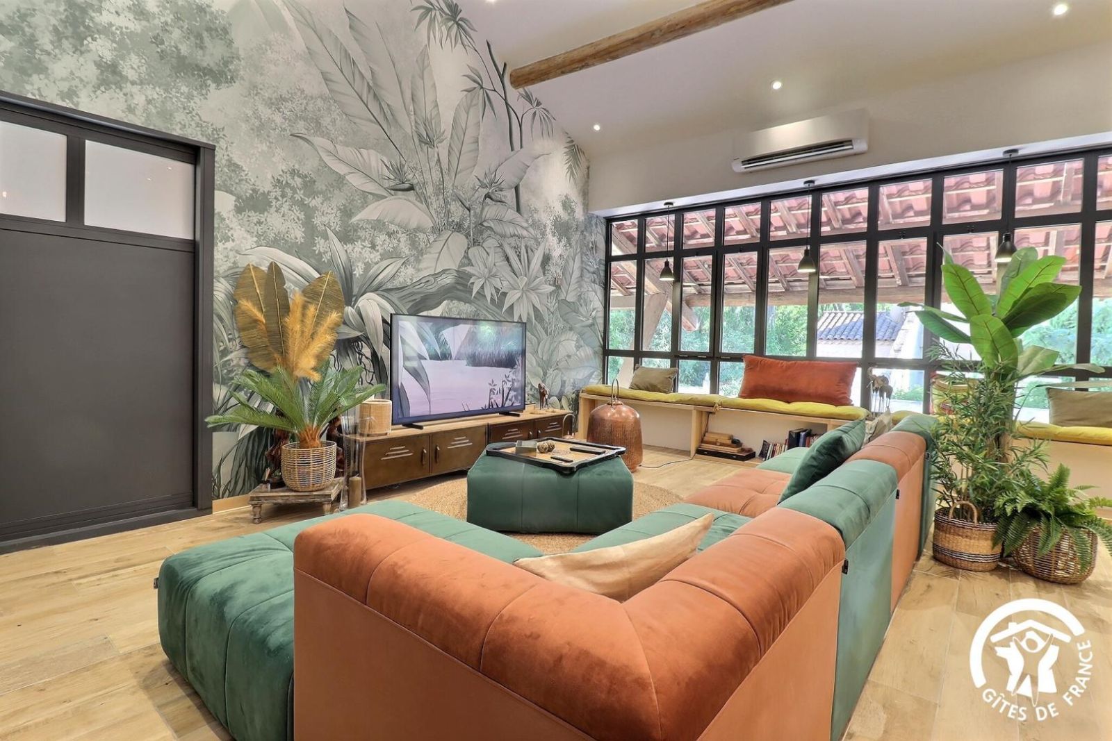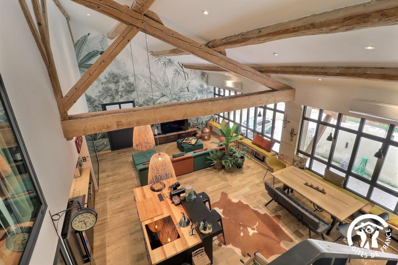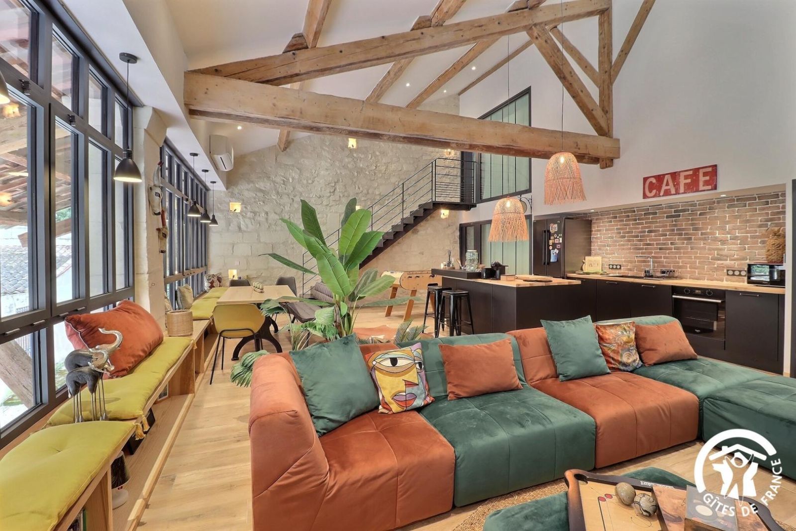 - Grande pièce de jour : cuisine équipée ouverte au milieu de la pièce, avec réfrigérateur/congélateur américain, four, micro-ondes, lave-vaisselle, 3 feux induction. Salon avec grand canapé d'angle, table basse, TV connectée. Table repas avec banquette et chaises. Babyfoot