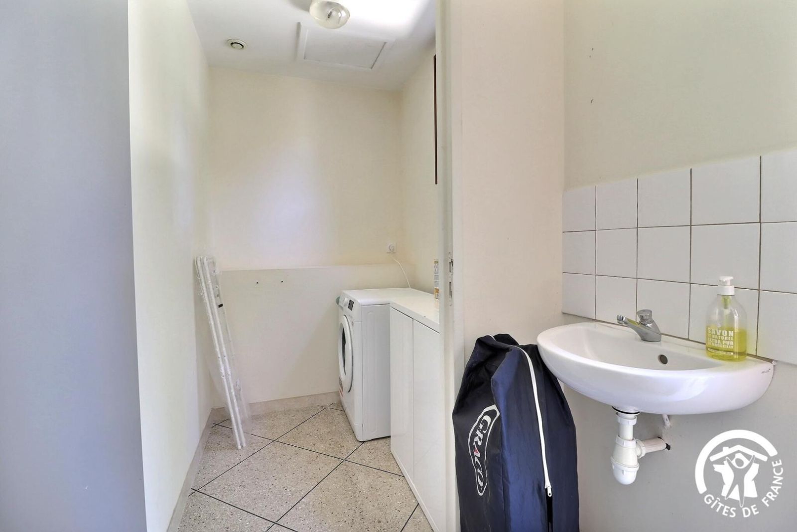 Espaces communs : jardin de 2000m², salon de jardin, barbecue, parking et laverie avec wc, lave-linge, lavabo, étendoir à linge, fer et table à repasser.