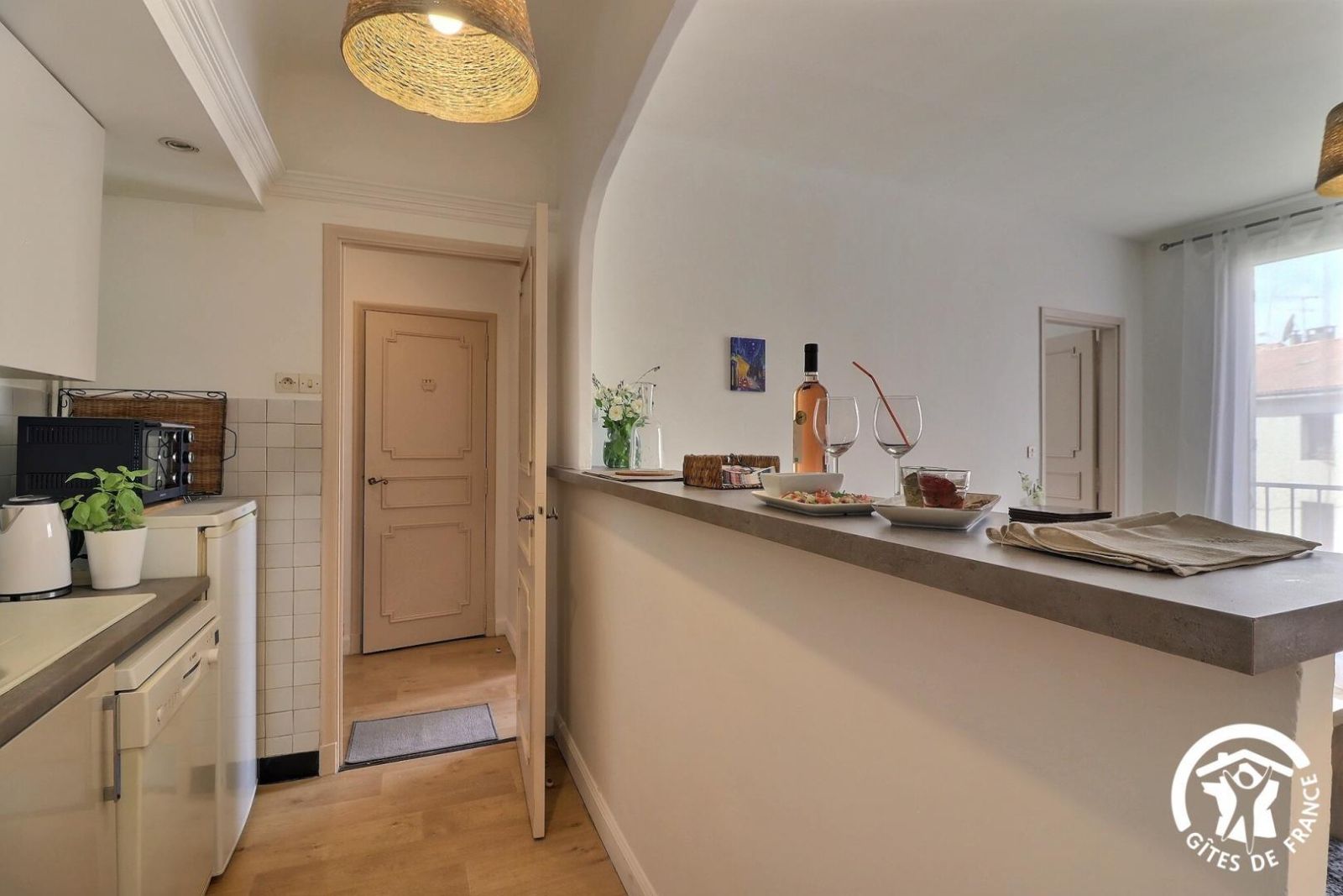 - Cuisine ouverte sur le séjour : réfrigérateur, combiné four/micro-ondes, lave-vaisselle, 2 feux gaz, hotte aspirante et lave-linge dans un placard fermé. Salon avec canapé convertible 100x190cm, table basse, TV, table et 2 chaises.