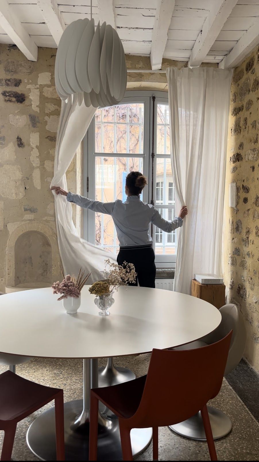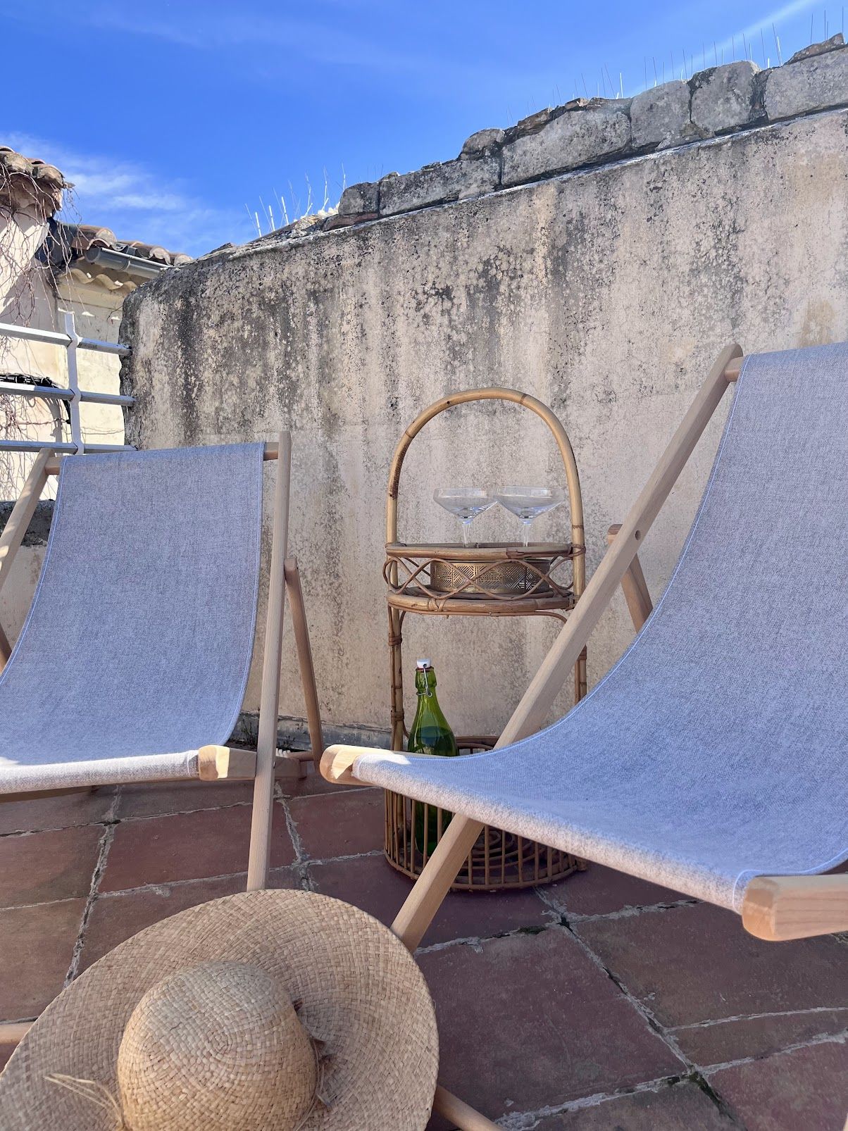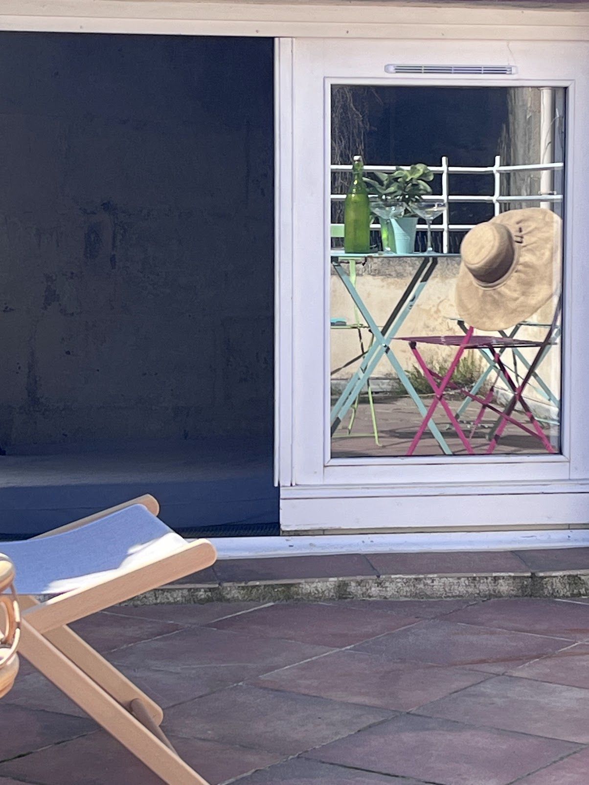 Un bureau pouvant servir d'espace de travail ou de détente yoga par exemple qui s'ouvre sur une grande terrasse avec vue dégagée et partielle sur les Arènes à quelques mètres.