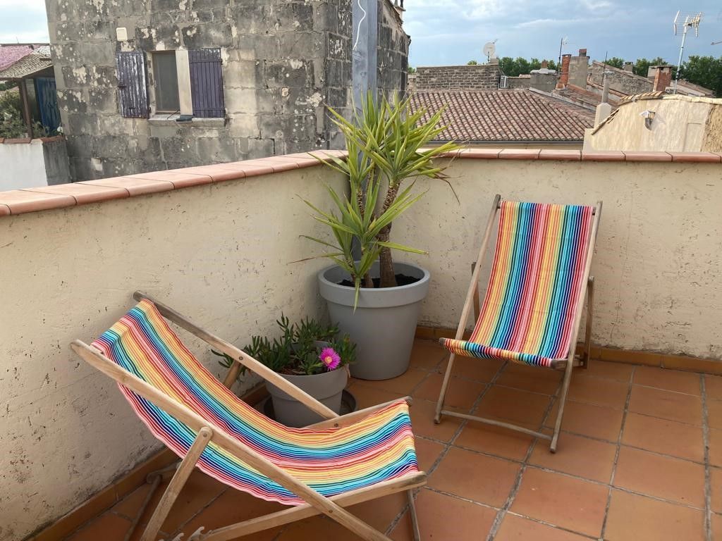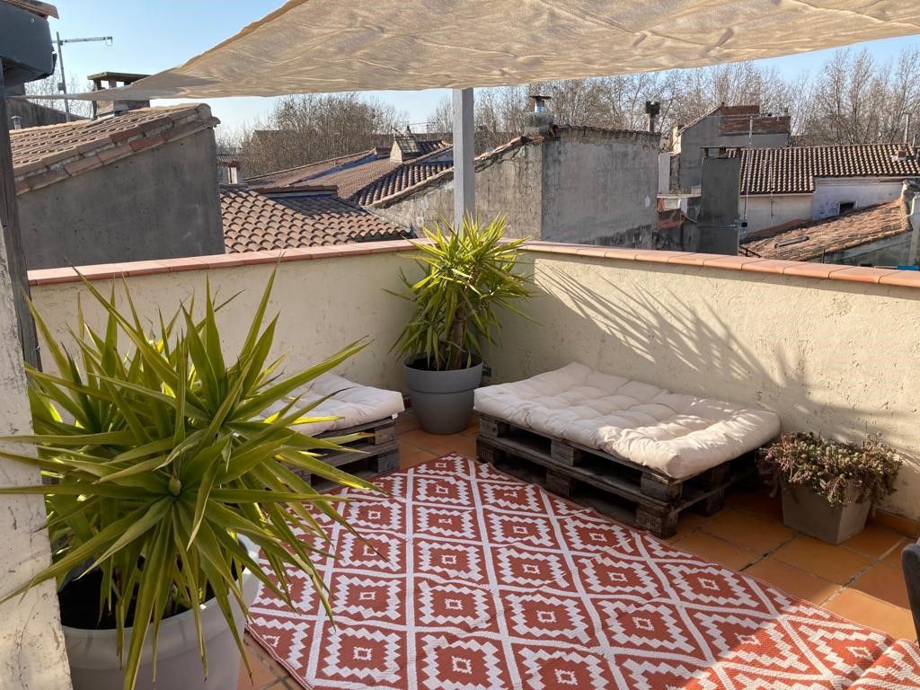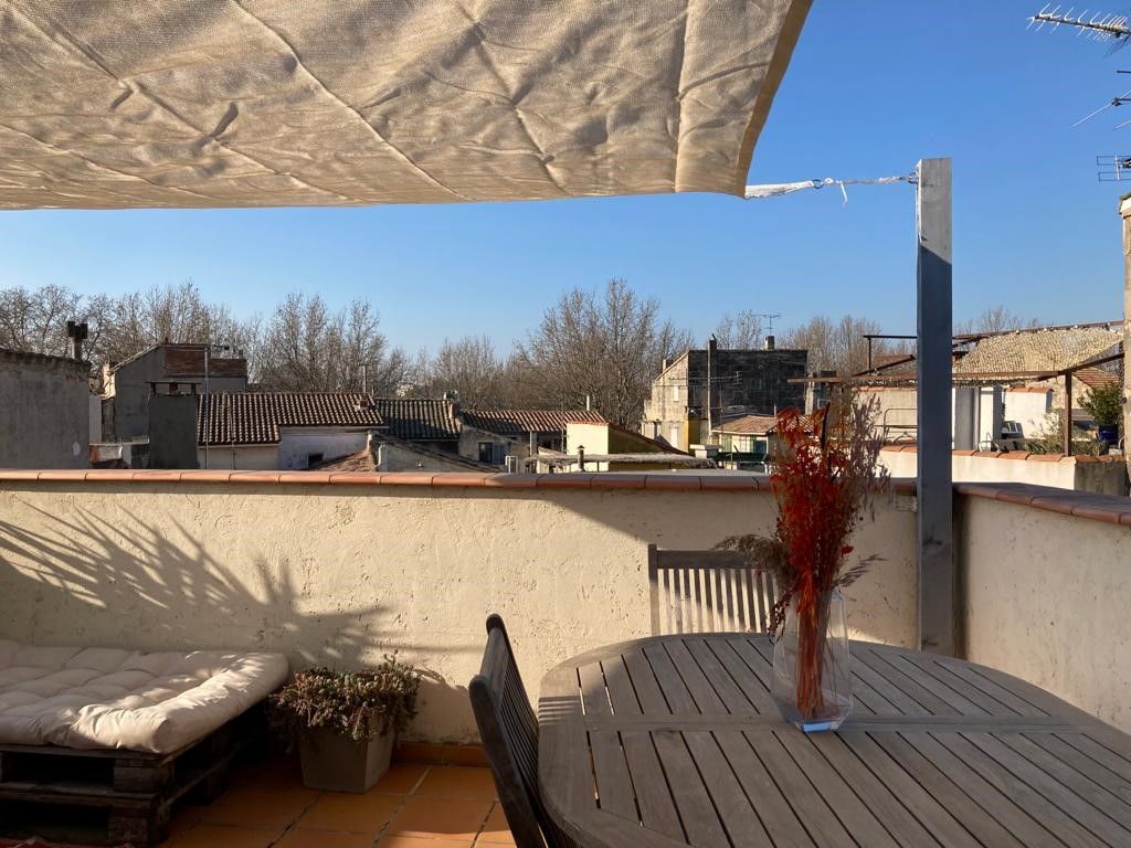 La Maison Nomade située dans le quartier historique d la Roquette, rue Génive, ancienne rue des pécheurs. Maison de charme du 18ème, de 125m² avec sa terrasse sur le toit a conservé ses beaux volumes, poutres apparentes, murs en pierre, escalier à hélice.