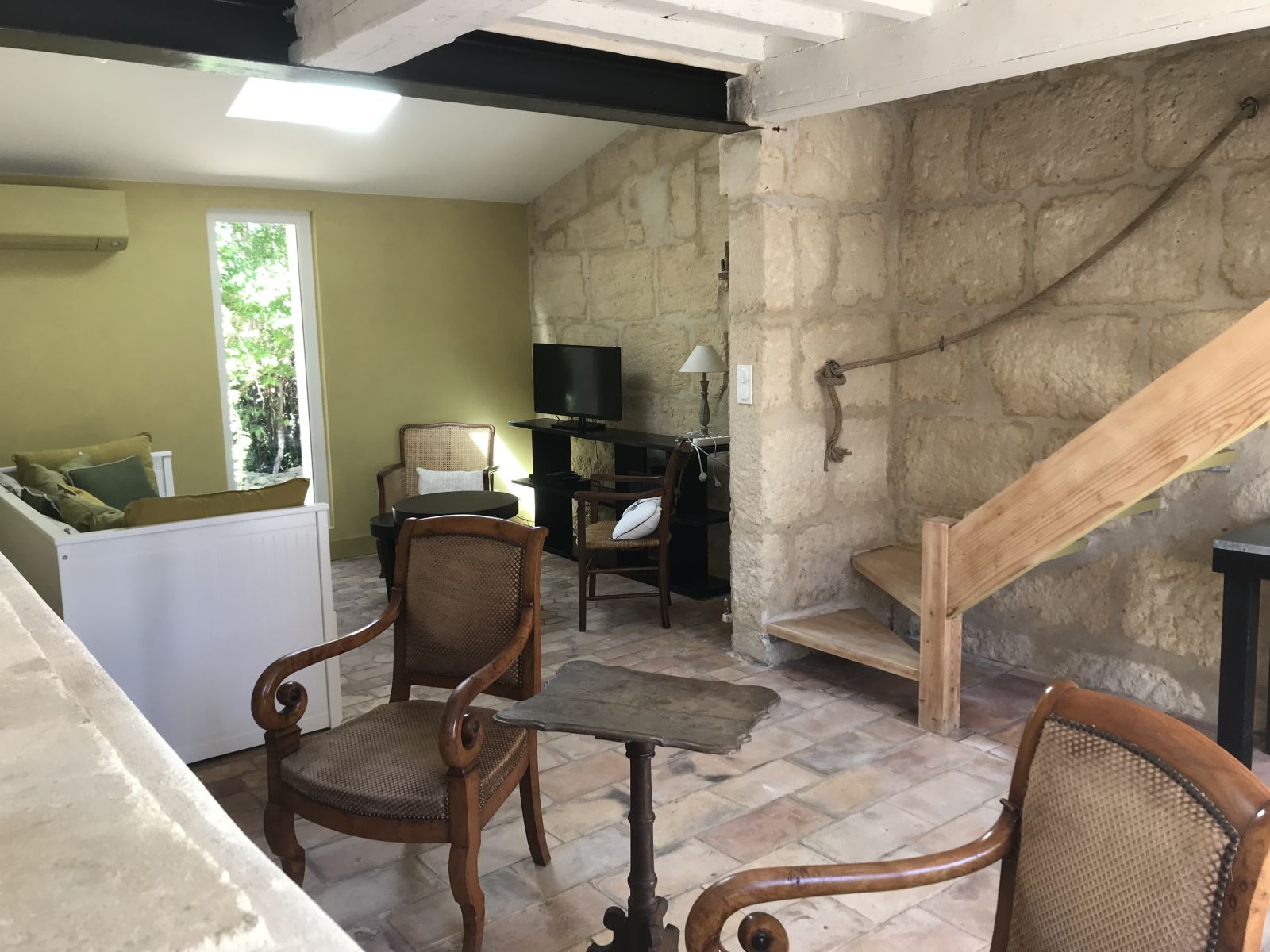 La cuisine communique avec la salle à manger, qui possède une grande table pour 6, et du mobilier contenant la vaisselle. Elle est ouverte sur la terrasse couverte, un escalier permet d'accéder à l'étage.Dans le salon, qui communique avec la cuisine, trouverez un canapé-lit (180 cm), une TV écran plat avec connexion wifi, lecteur DVD, une cheminée en fonction, et un escalier vers l'étage.