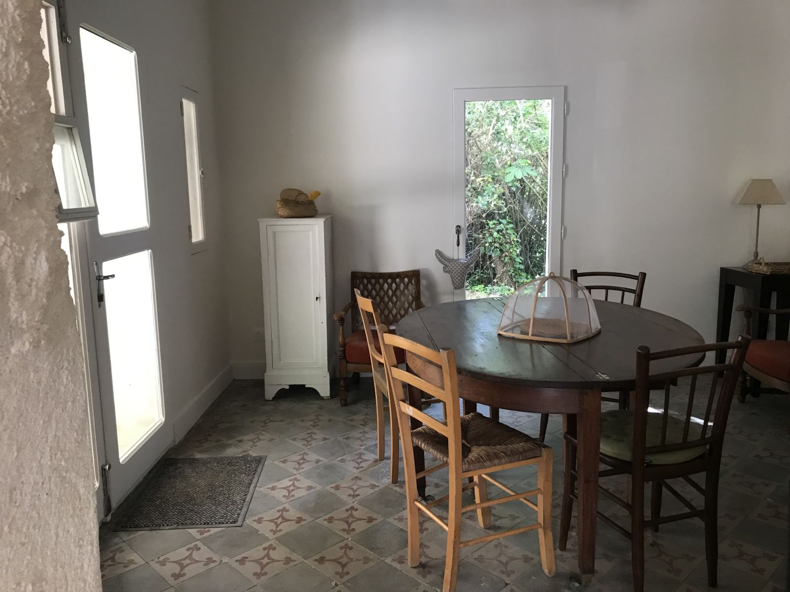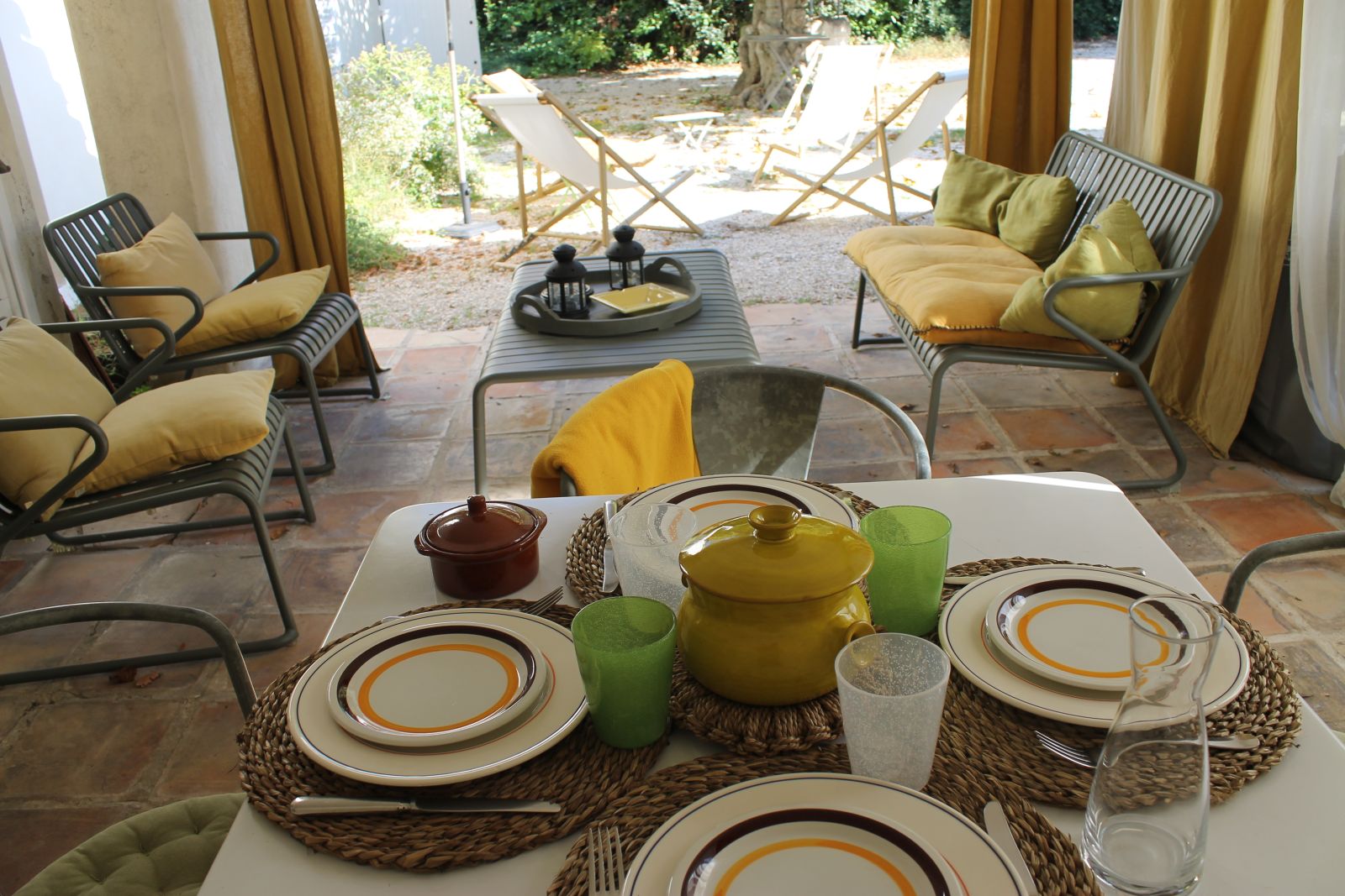 Le gîte, situé à l'arrière du Mas des Figuiers et donnant sur la cour du puits, comprend une terrasse couverte au rez-de-chaussée, équipée de 4 chaises, une table, un salon de jardin, des chaises longues, un parasol, et un barbecue. Une cuisine équipée ouverte sur la salle à manger, une arrière cuisine avec WC, lave-main, lave-linge , etc... et un grand salon avec cheminée et canapé-lit complètent ce premier niveau.