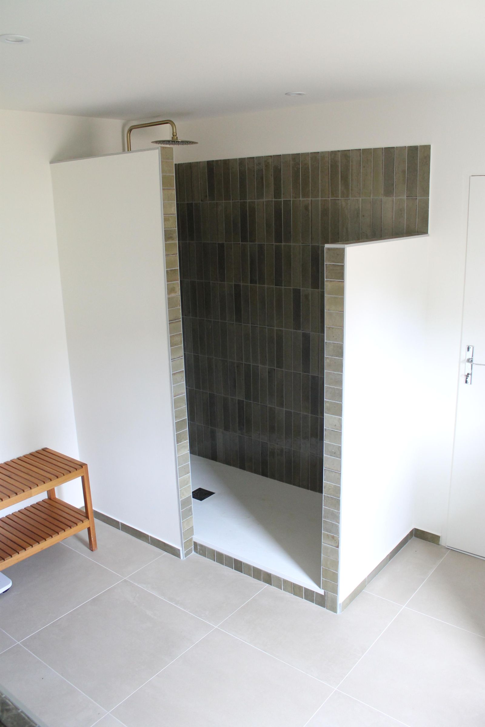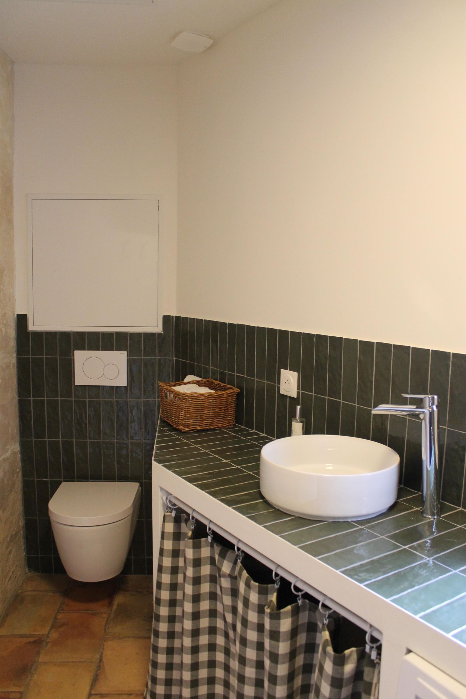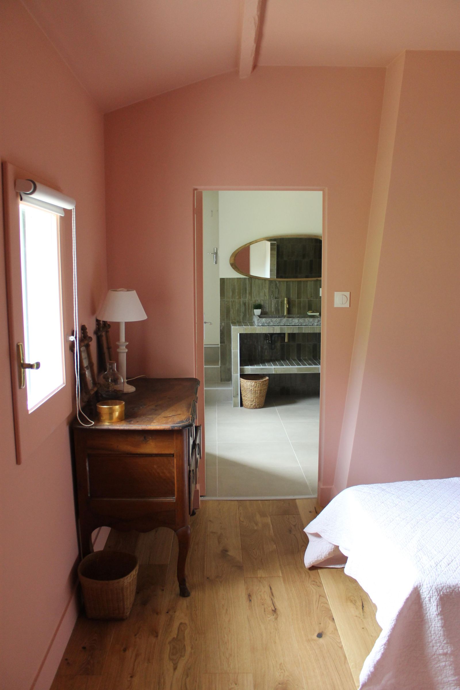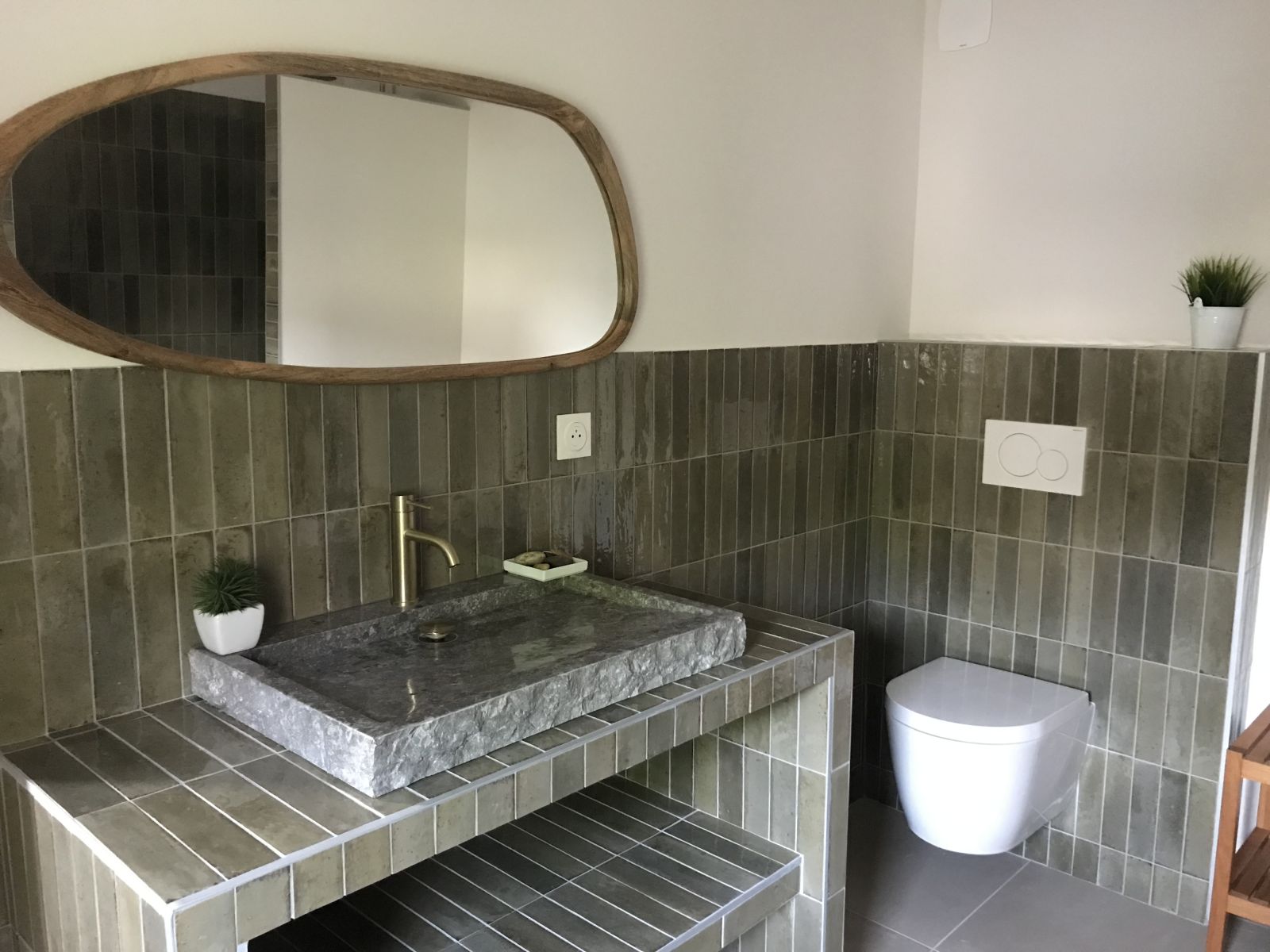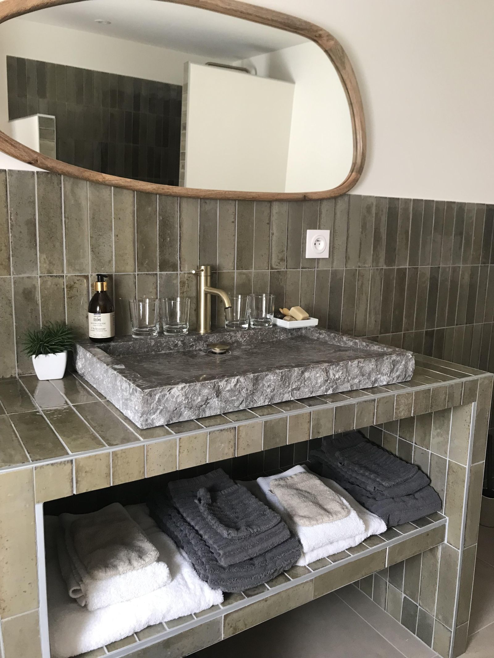La salle de bain attenante est équipée d'un sèche serviette électrique, d'une commode et d'1 banc avec paniers de rangement et patères. Elle possède une douche Italienne, un WC et une grande vasque en pierre naturelle.
