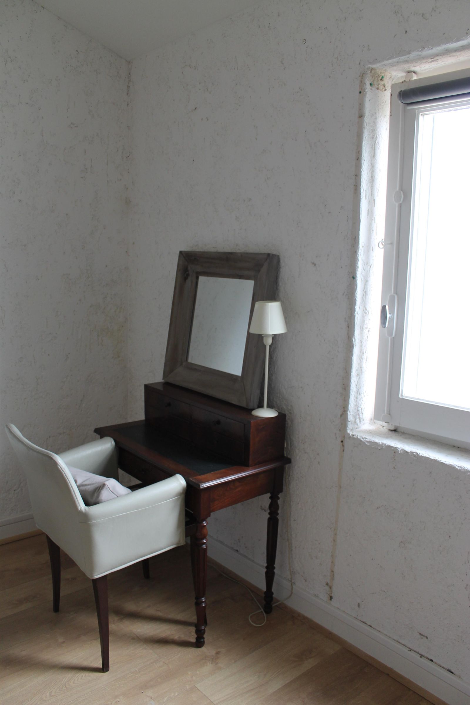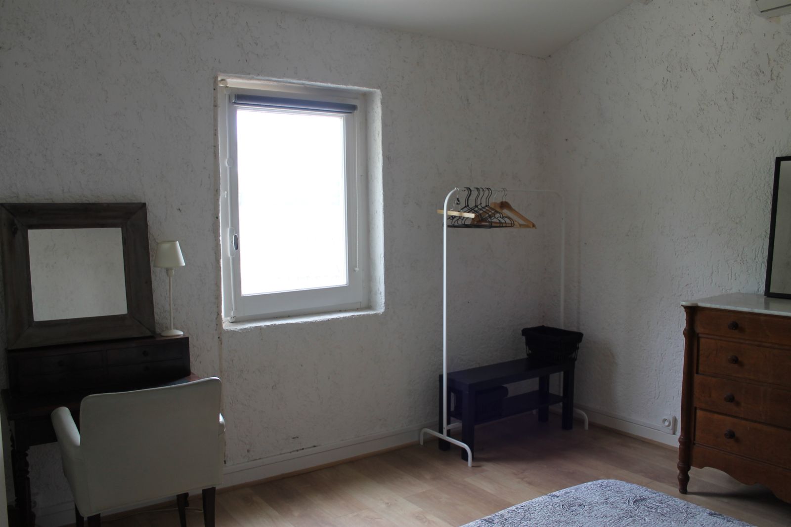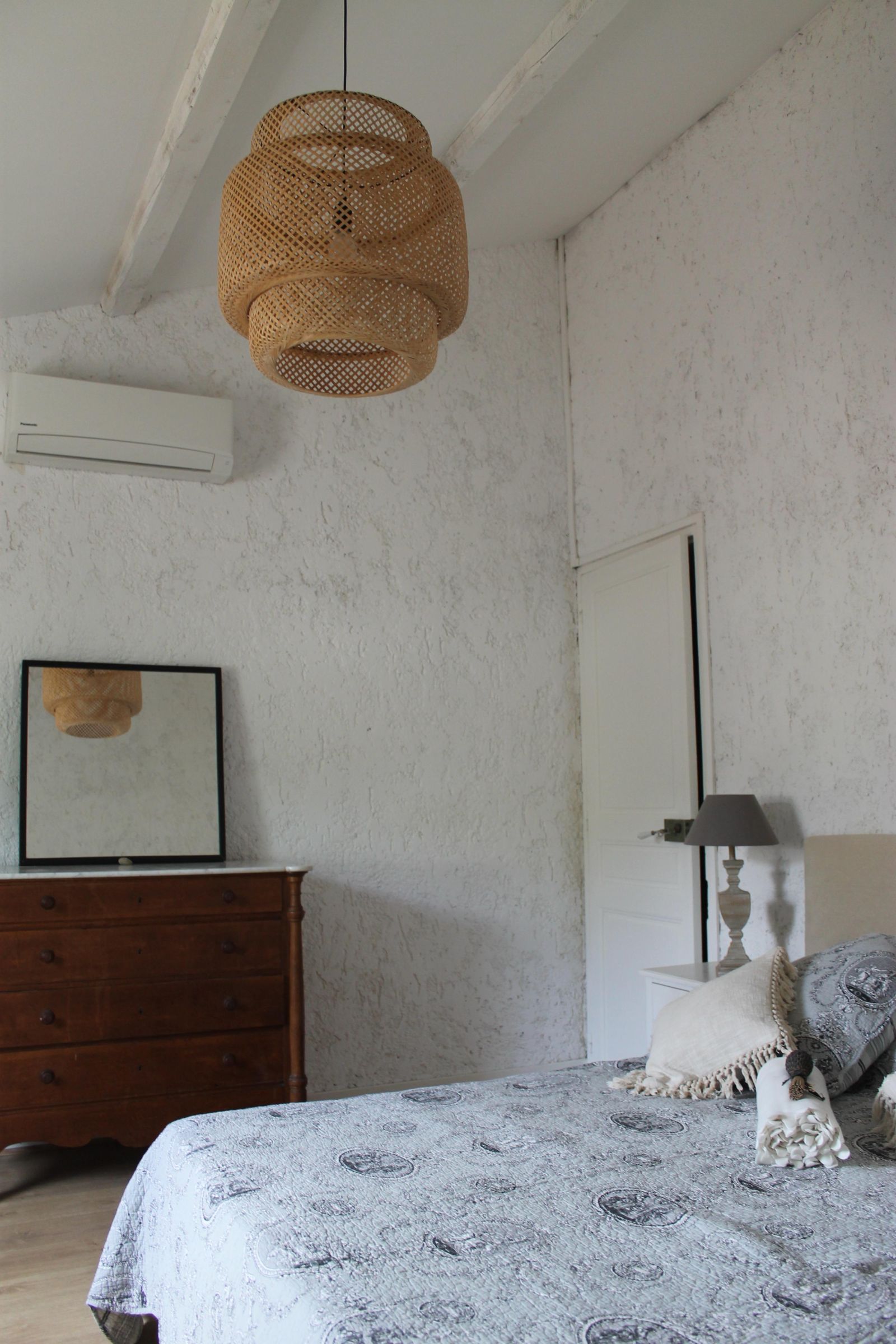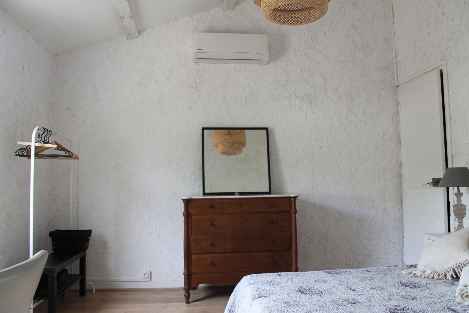 À l'étage la chambre blanche est équipée d'un lit en 160cm avec sommier à lattes. Une commode, une penderie, un secrétaire avec fauteuil, 2 tables de chevets avec tiroir et lampes. Elle possède une moustiquaire, un volet persienne, un rideau occultant, une climatisation réversible. Possibilité d'ajouter un lit parapluie pour bébé (gratuit, demandez le à la réservation) ou un lit pliant 90cm.
