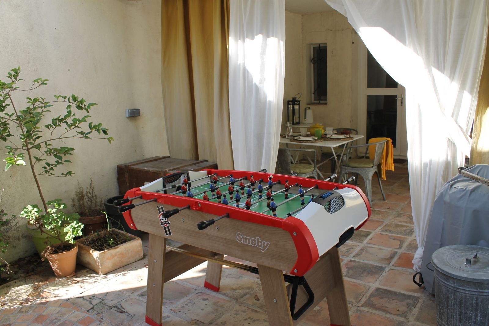Aux abords de la piscine vous trouverez des transats, tables, chaises et parasol, ainsi que quelques jeux d’extérieur.