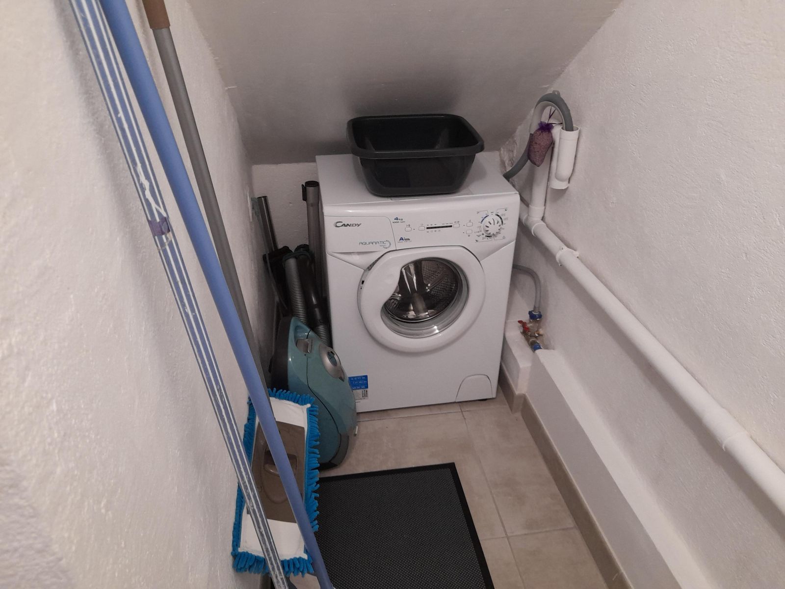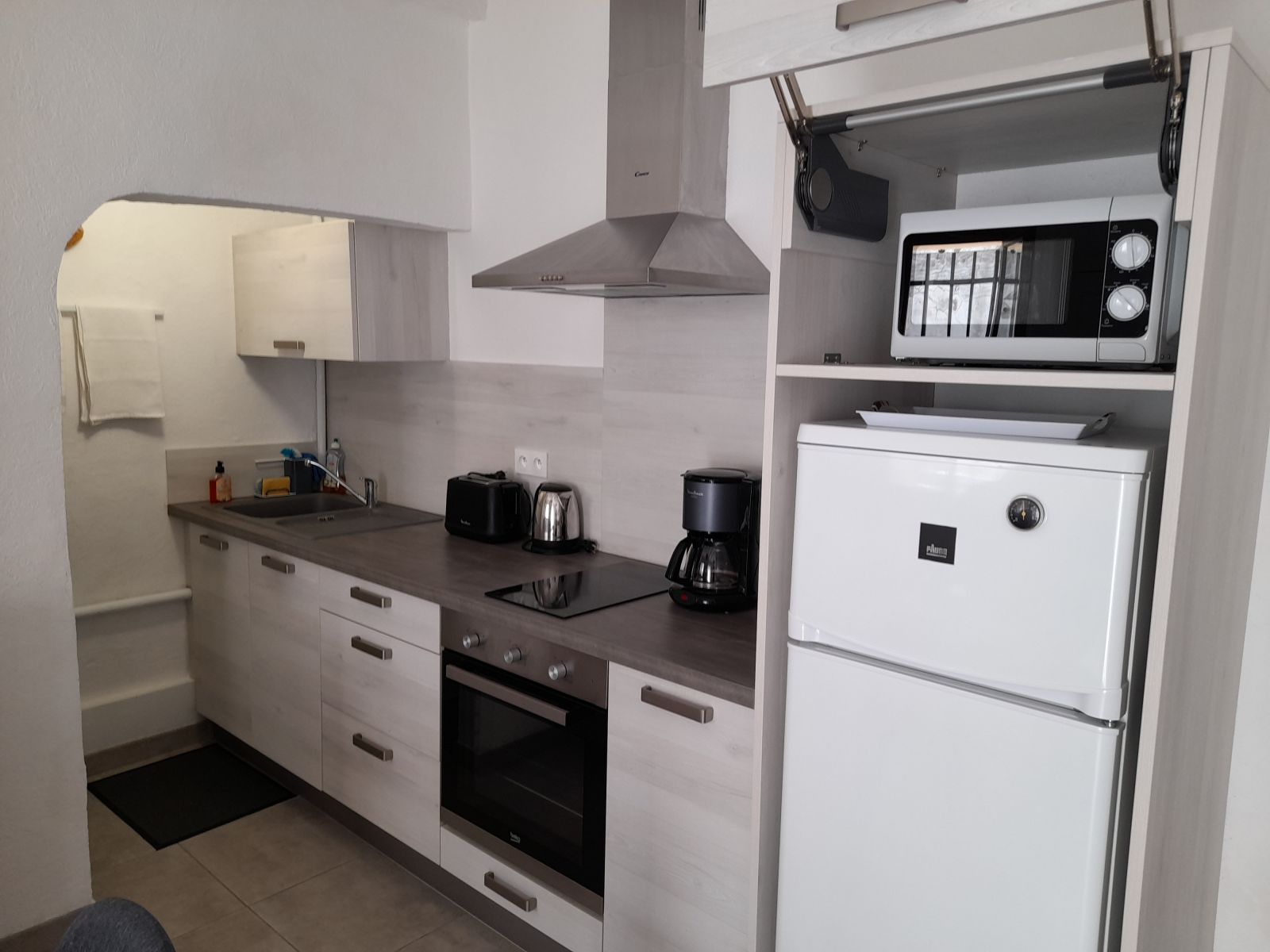 Rez de chaussée : cuisine équipée, four, plaque de cuisson vitrocéramique, micro-ondes, frigo congélateur, bouilloire, cafetière, grille pain, lave linge et toute la vaisselle nécessaire.