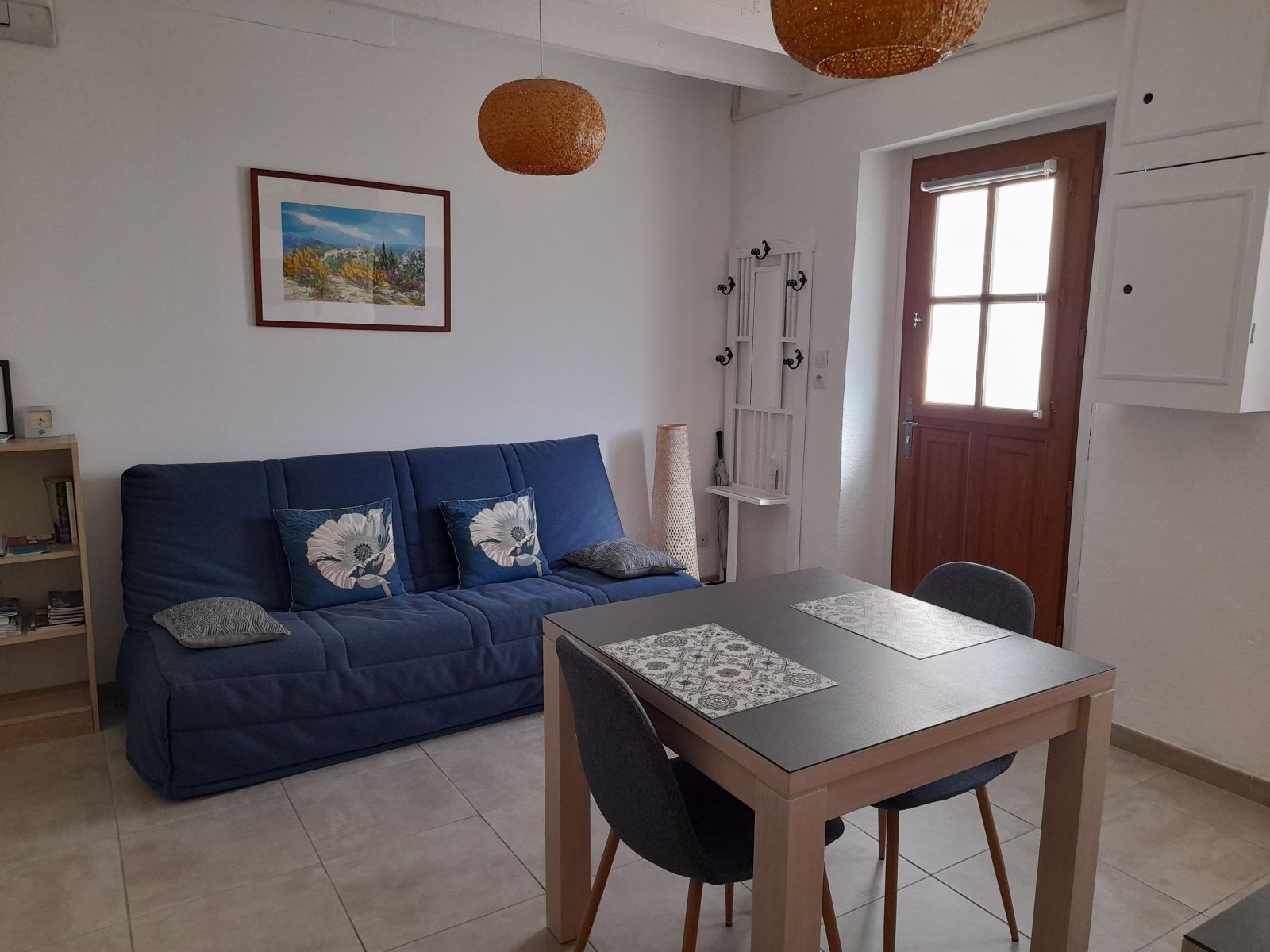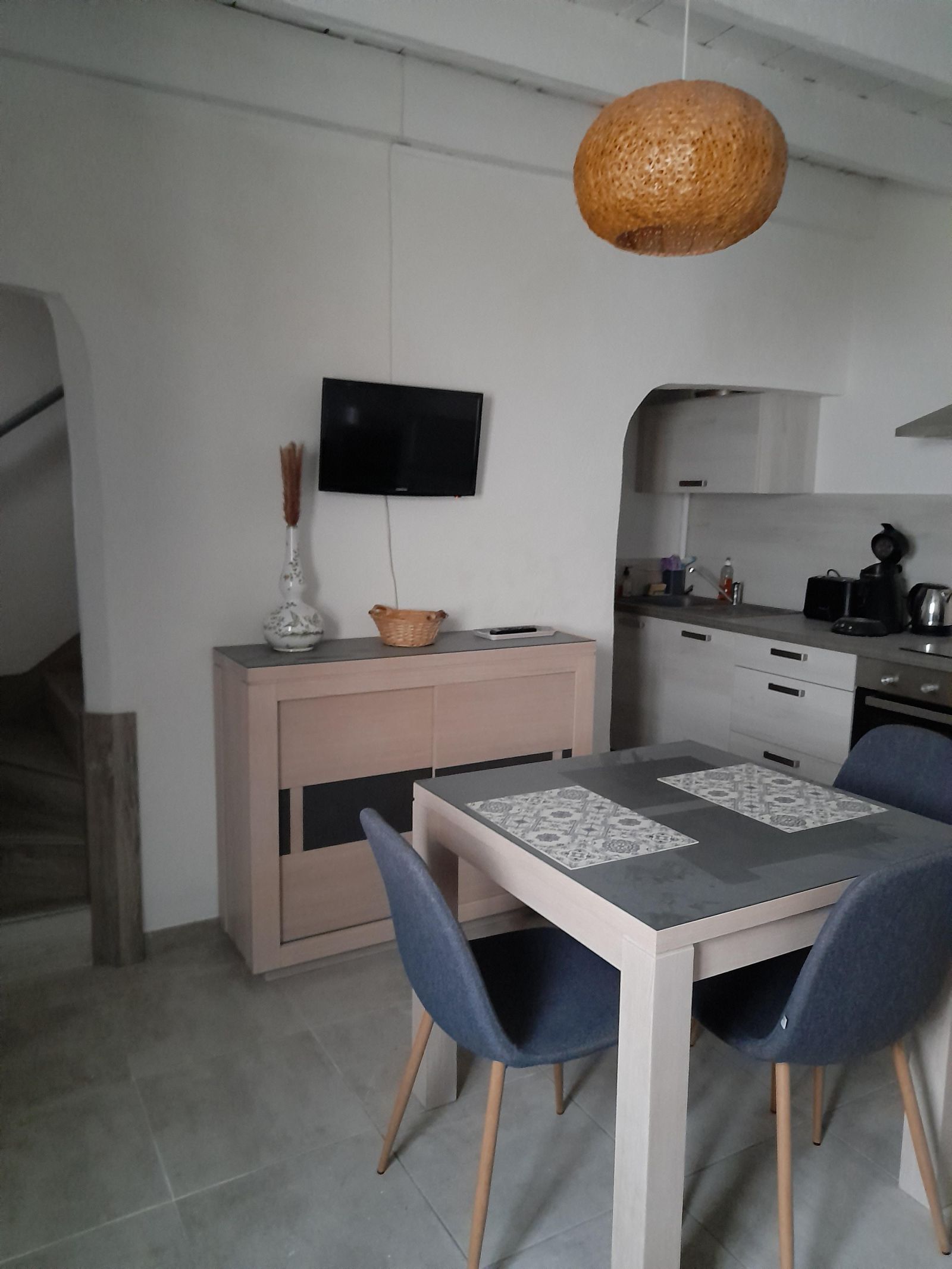 Coin repas, espace repos avec canapé clic clac, TV écran plat.