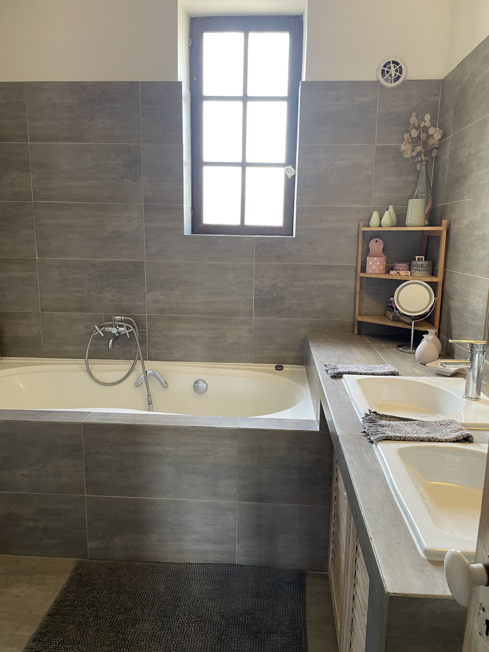 - Une grande et belle salle de bain avec baignoire, douche et WC.