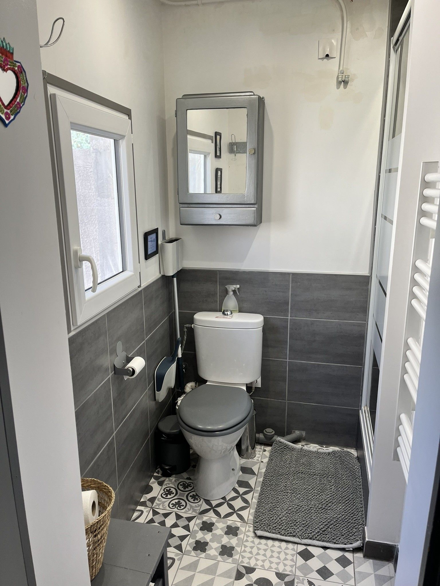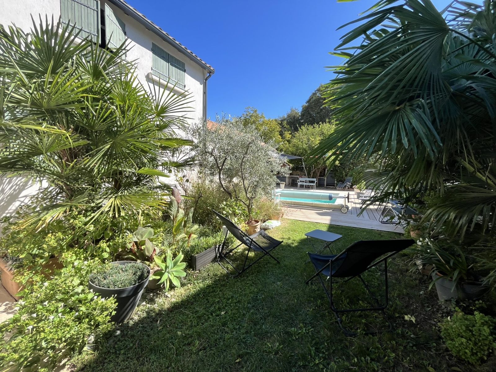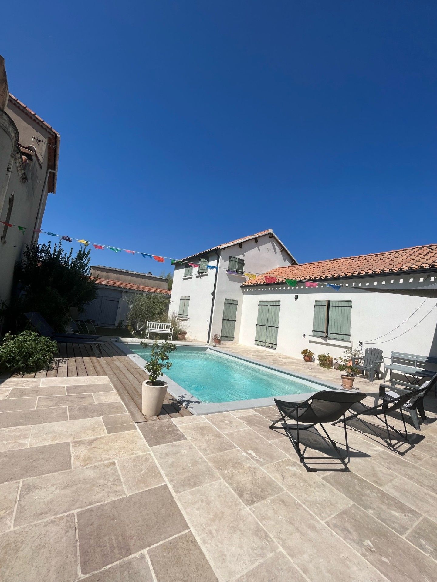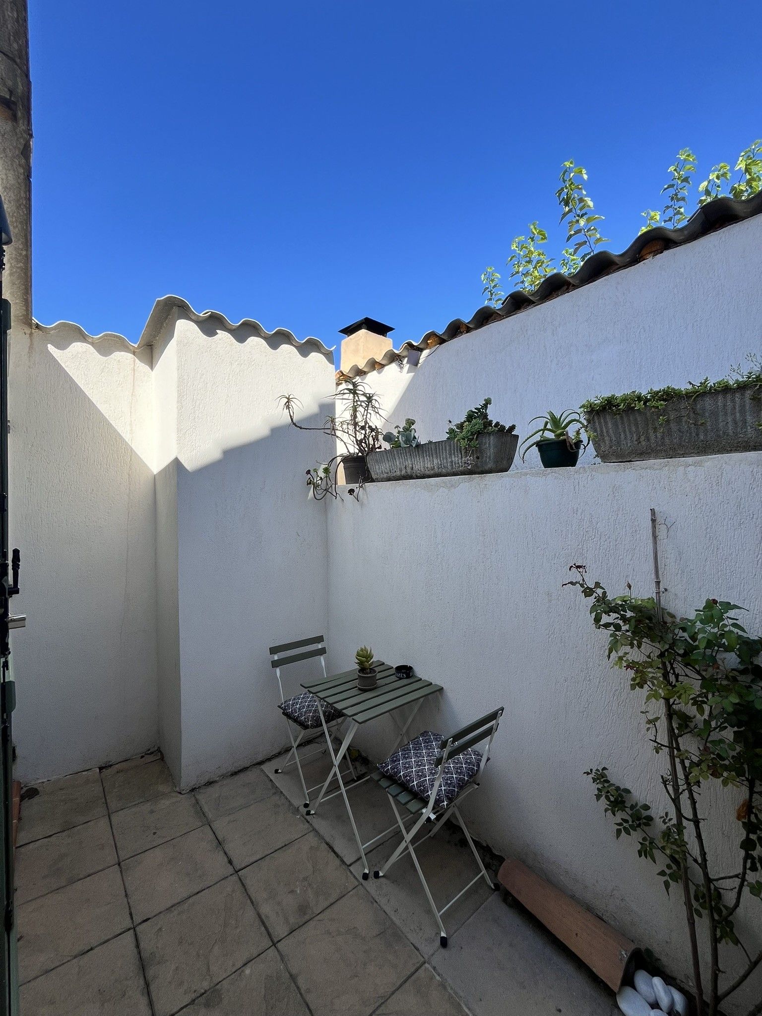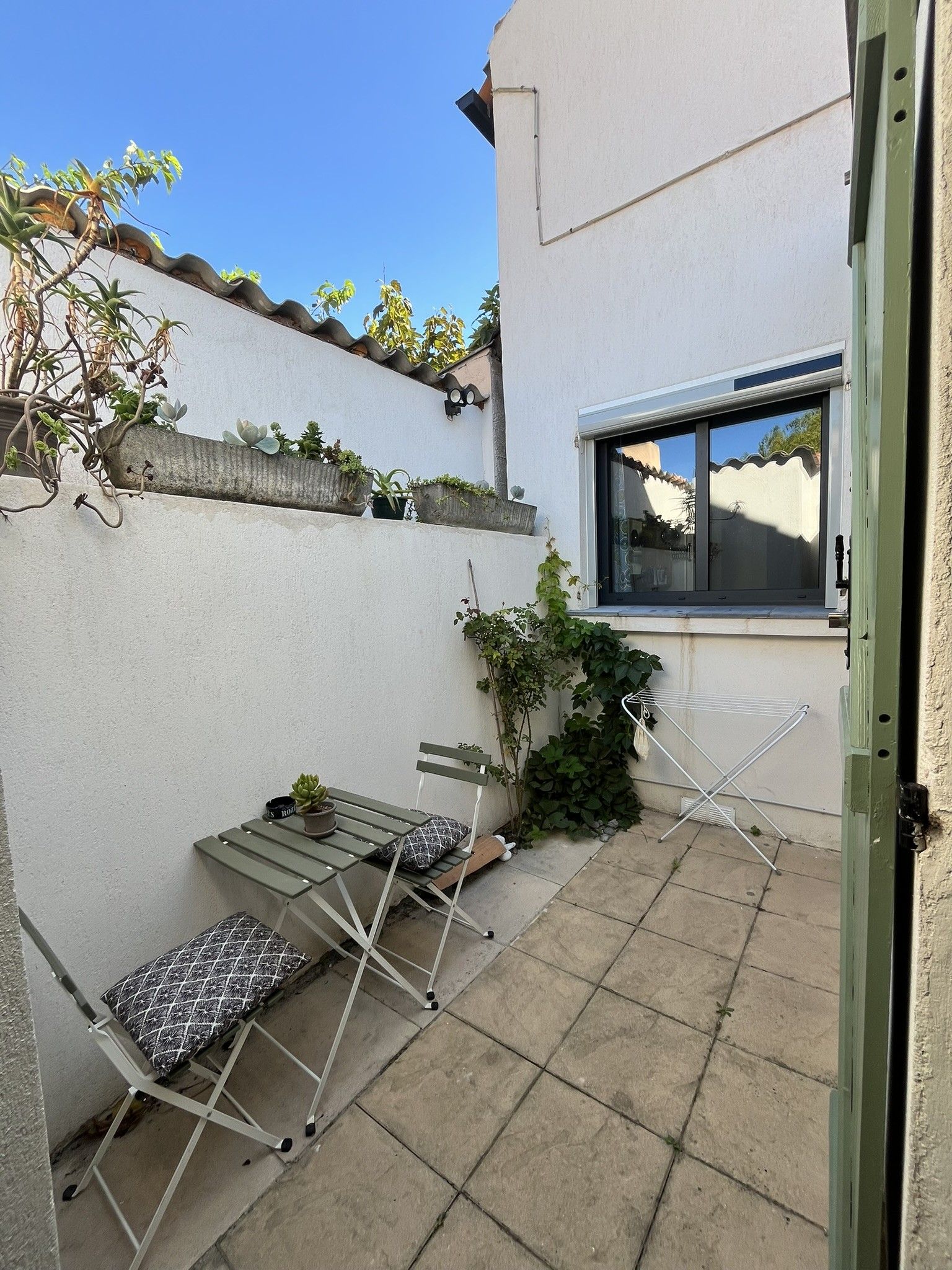 Petit coin extérieur avec une table. Vous aurez également accès au jardin et à la piscine (en saison) qui seront partagés avec les hôtes.