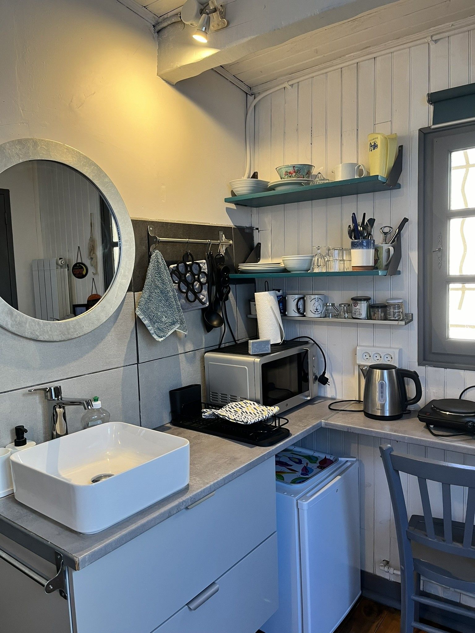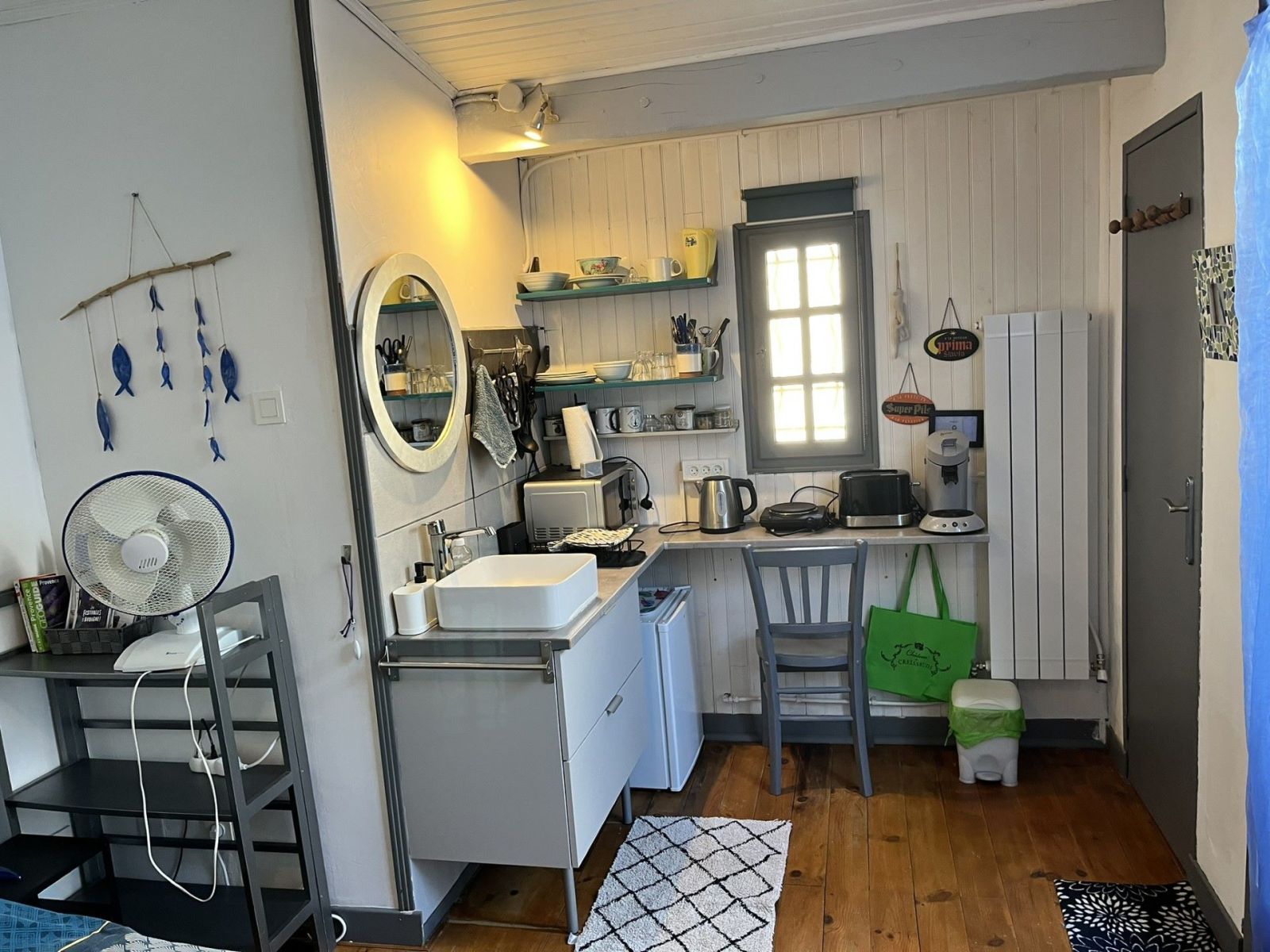 Studio indépendant doté d'une salle de bain, d'un lit deux places et d'une kitchenette équipée (cafetière, petit frigo, four micro ondes, plaques électriques, grille-pain, vaisselle).