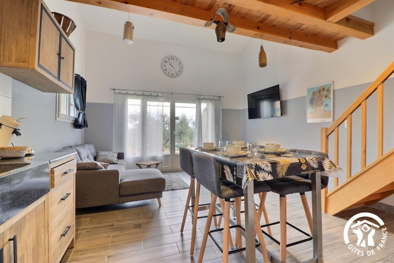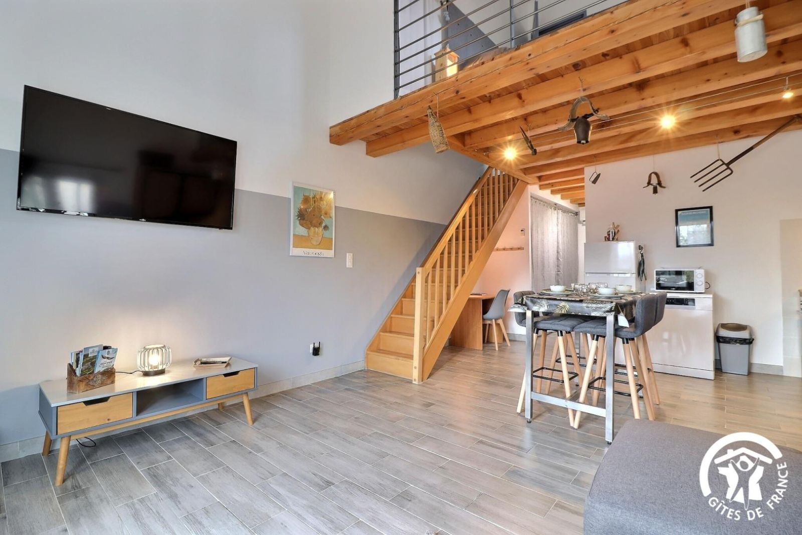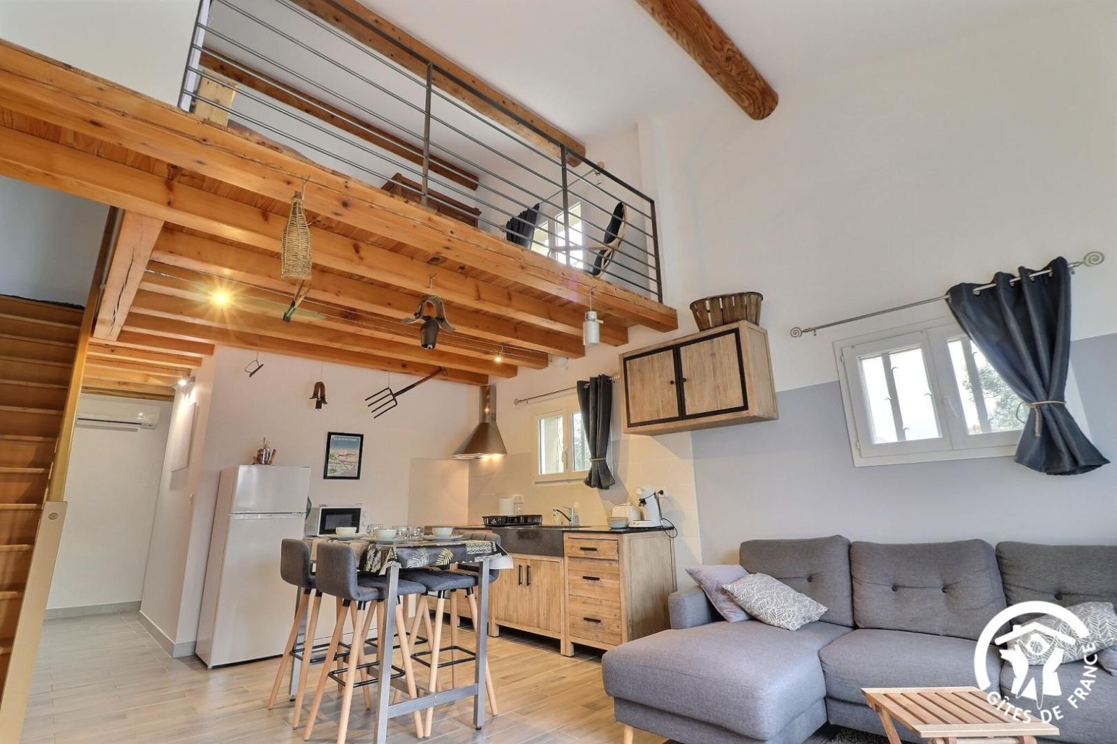 - Un séjour avec belle hauteur sous plafond, salon avec canapé d'angle et grande TV écran plat 138cm. Espace repas avec table haute et 4 chaises hautes. Cuisine équipée ouverte sur le séjour avec plaque 3 feux induction, hotte, four, micro-ondes, lave-vaisselle, réfrigérateur/congélateur, cafetière à dosettes Senseo, grille-pain. Coin bureau. Grand dressing pour rangements.