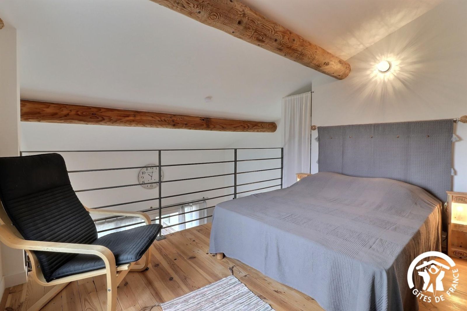 - 1ère chambre en mezzanine donnant sur le séjour avec 1 lit 2 personnes 140x190cm, étagères, armoire et fauteuil.