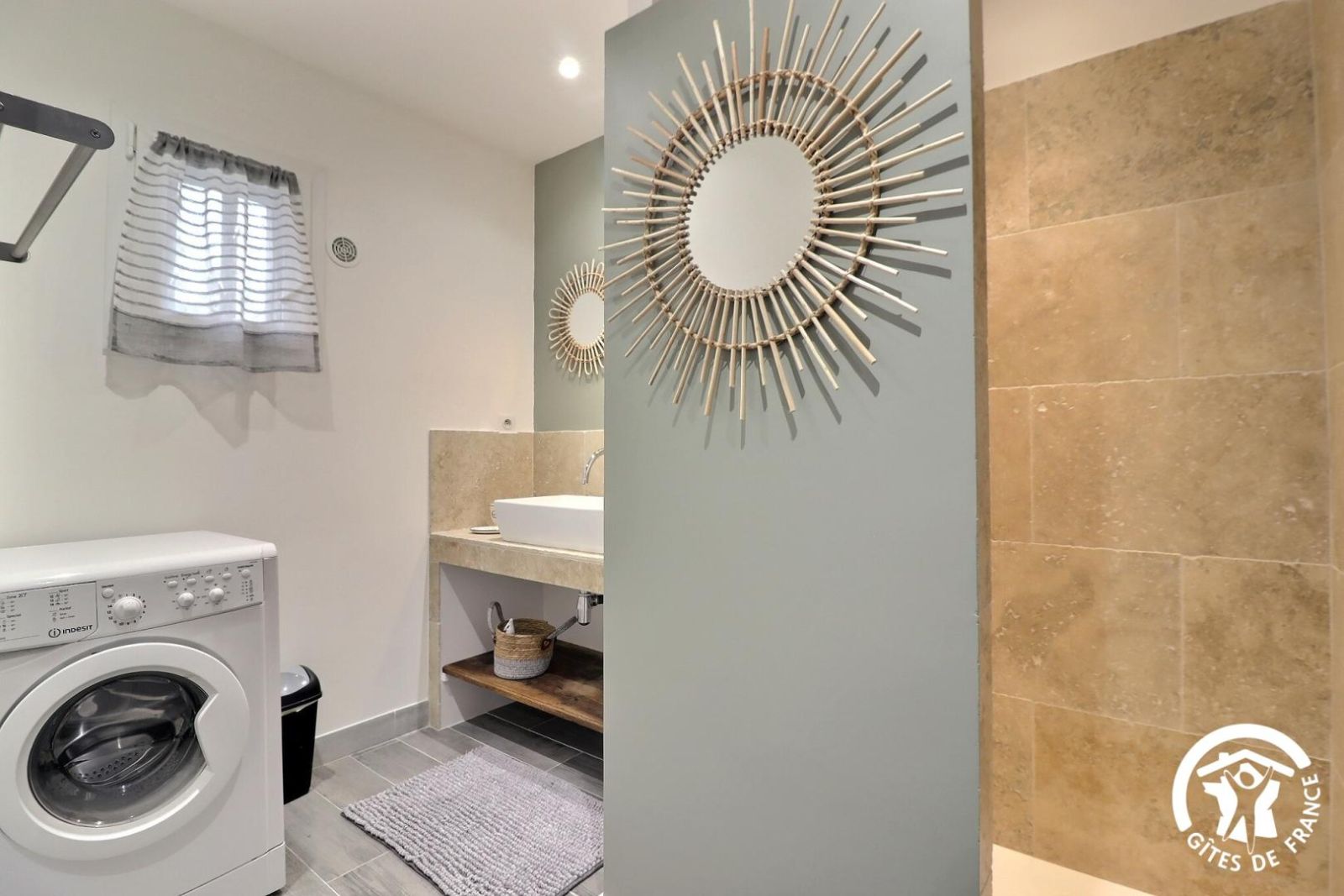- Une salle d'eau avec douche type italienne 120x80cm, vasque, étagère, porte-serviettes et lave-linge.