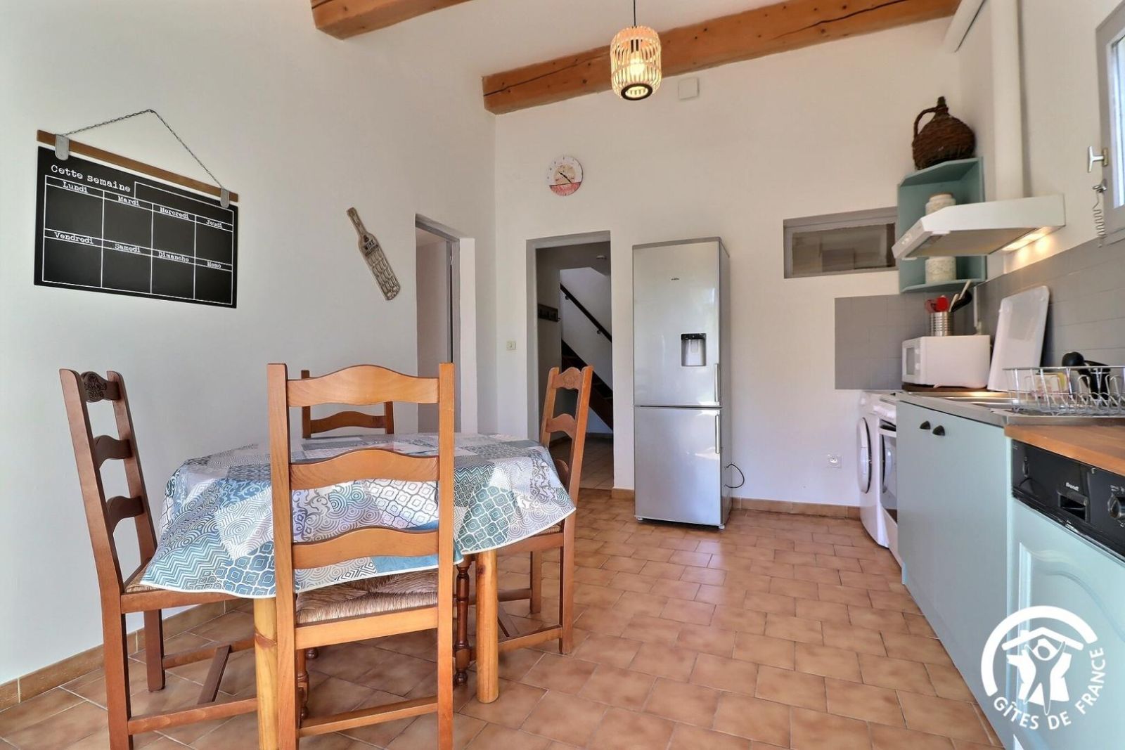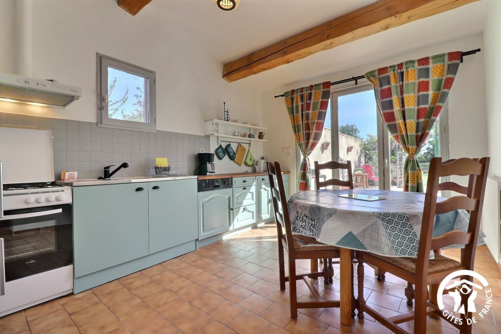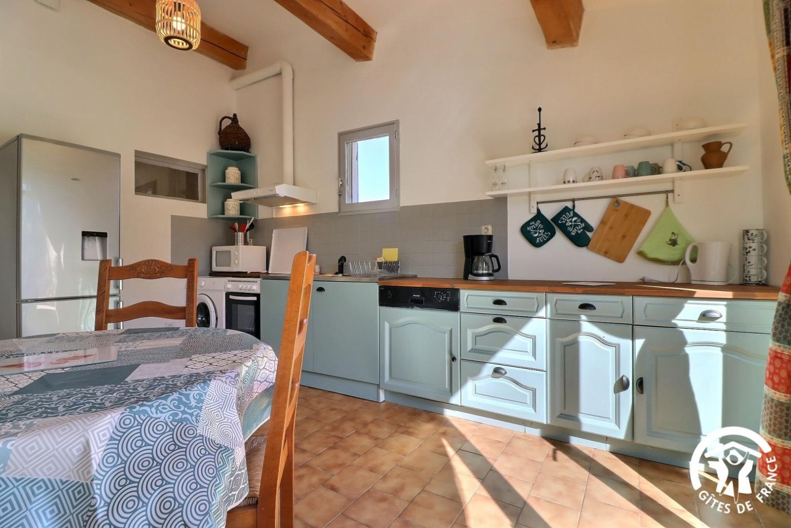 - Une cuisine indépendante avec espace repas et accès à la terrasse. Équipée avec lave-vaisselle, micro-ondes, gazinière 4 feux + four à gaz, hotte aspirante, lave-linge, réfrigérateur/congélateur.
