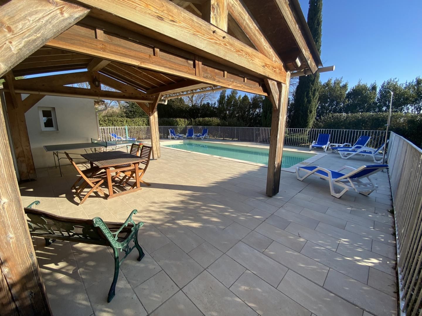 - Une chambre enfants à l'étage avec 2 lits superposés 90x190cm et 2 lits 90x200cm, petit dressing et fenêtre. Cour privative close de 130 m² fleurie, terrasse avec salon de jardin sous la tonnelle, barbecue. Équipements communs : piscine (10 x 3,75m, profondeur max 1,4m, accessible du 01/04 au 31/10 de 10h à minuit), terrain de pétanque, aire de jeux pour enfants (trampoline, cabane de jeux, toboggan, portique...) et table de ping-pong.