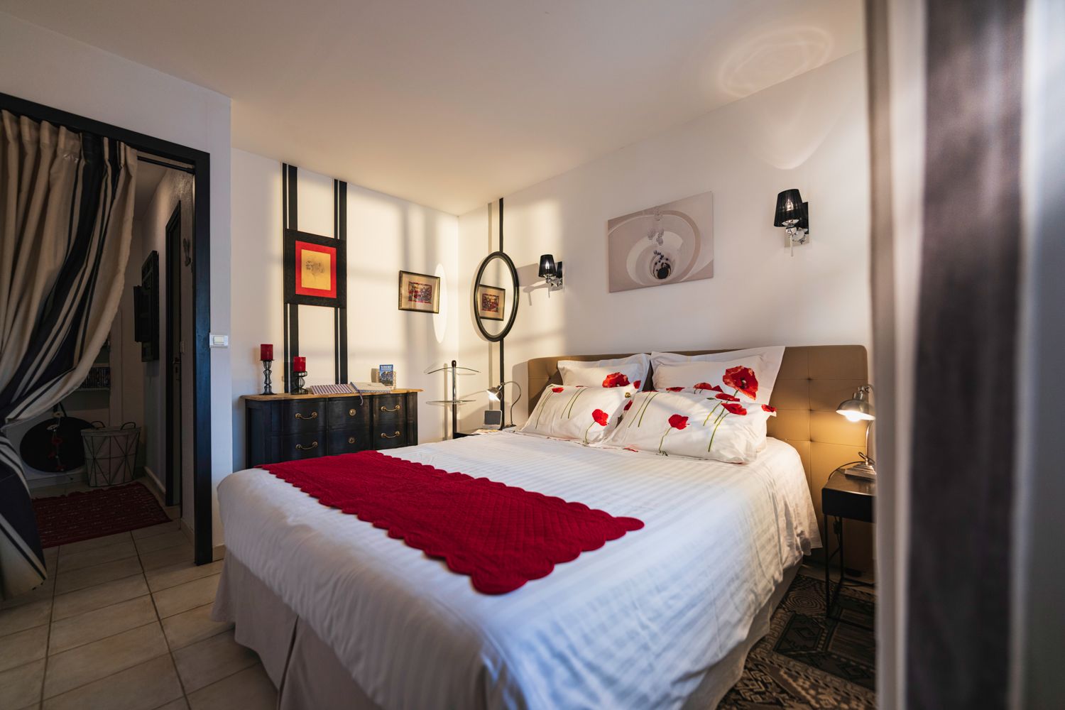 Grand salon/séjour avec canapé lit, wifi, cuisine américaine toute équipée, 1 Chambre avec lit 2 pers. (160/200), 1 salle d’eau avec WC, sèche-cheveux, coffre fort, fond d’épicerie courante et produits ménagers.