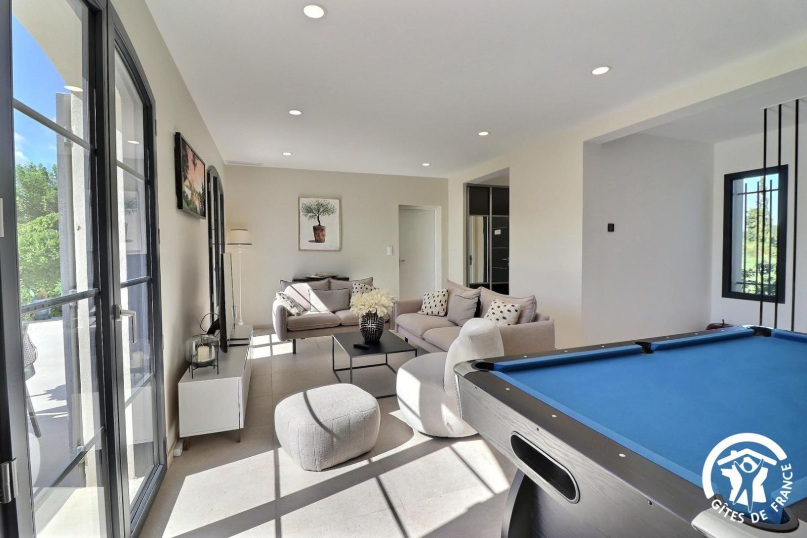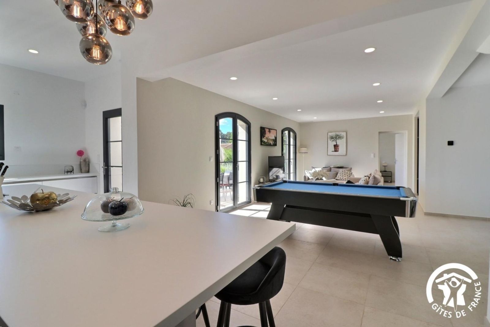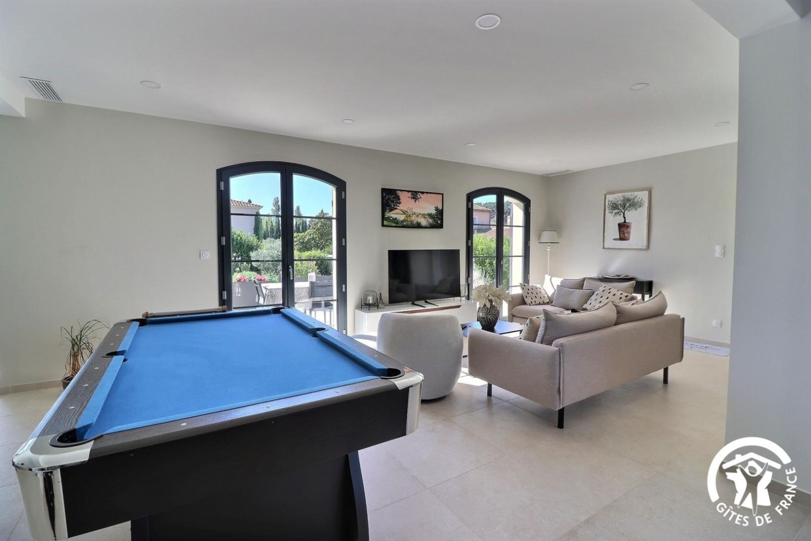 Villa moderne et lumineuse laissant entrer beaucoup de lumière naturelle. Vous trouverez une table de billard, piscine et conforts.