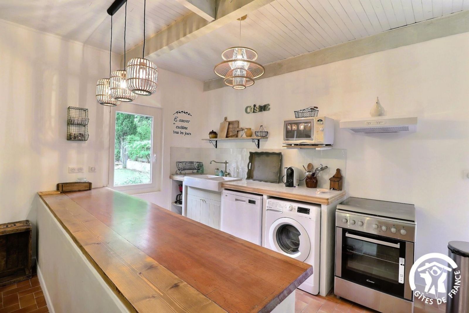 - Cuisine ouverte sur le séjour équipée avec cuisinière 3 feux gaz et 1 électrique, four électrique, hotte aspirante, réfrigérateur, congélateur, micro-ondes, lave-vaisselle et lave-linge.