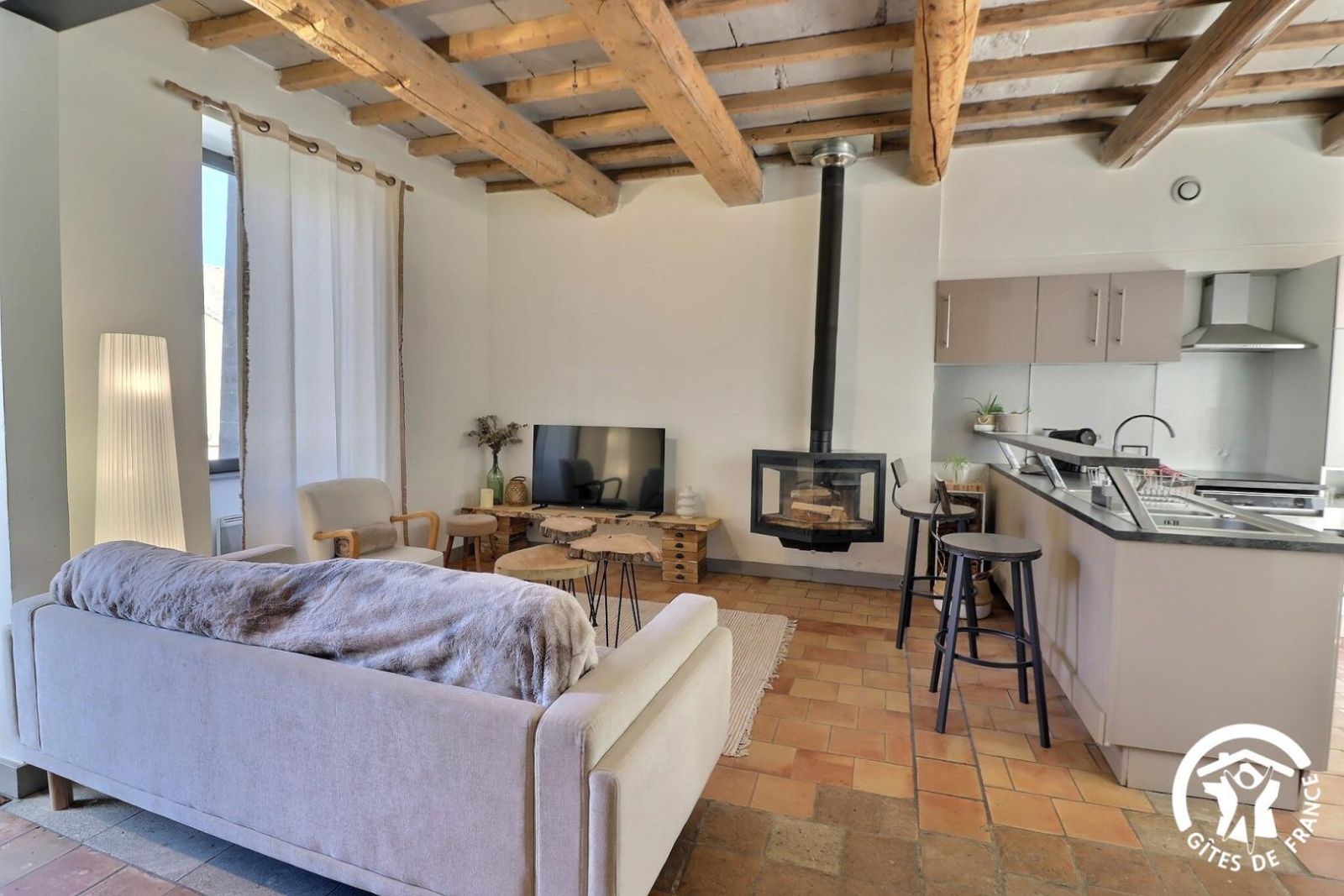 - un séjour avec canapé, fauteuil, poêle à bois, TV ouvert sur le cuisine