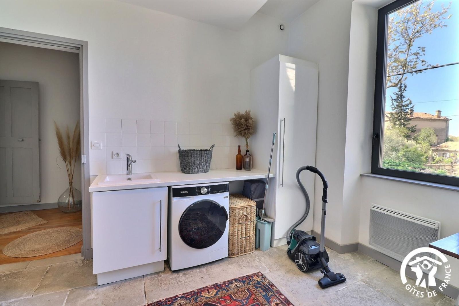 - une buanderie avec machine à laver, matériel de ménage et un bureau