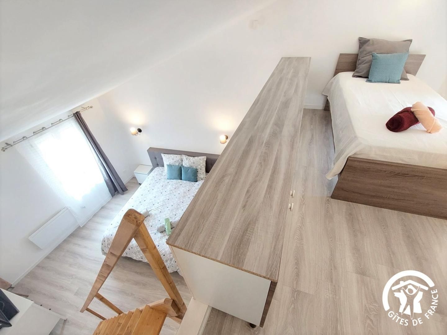 - 2ème chambre avec un lit 2 personnes 160x200cm, TV écran plat, escalier menant à la mezzanine avec un lit 90x190cm surplombant la chambre avec rangements. Vue sur les toits de Barbentane, l'église et les tours du château.