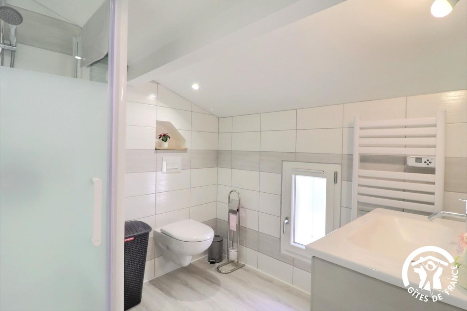 - Salle d'eau privative pour cette chambre avec vasque, WC, douche type italienne 80x80cm et porte-serviettes chauffant. Tout inclus : climatisation réversible (une unité à chaque étage), draps, linge de toilette et ménage de fin de séjour. Moustiquaires aux fenêtres. Gîte non fumeur.