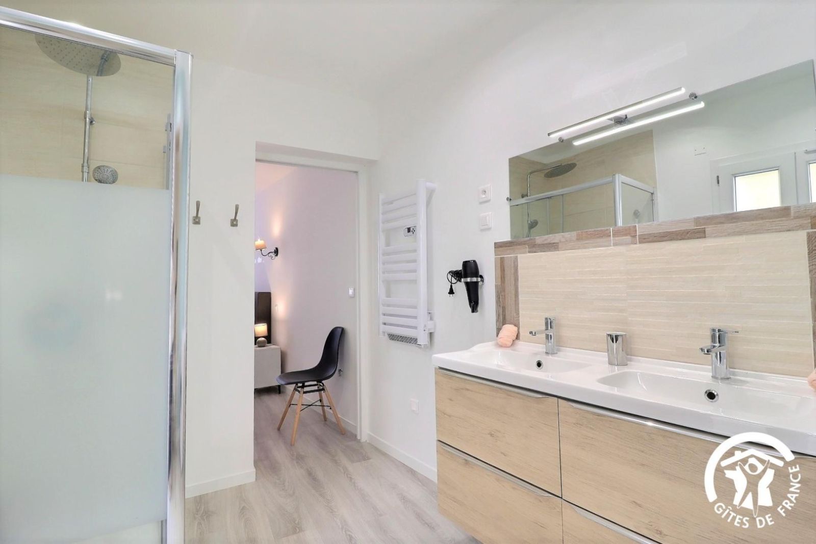 - Salle d'eau privative pour cette chambre avec double vasque, WC, douche à l'italienne 120x80cm et porte-serviettes chauffant. Accès à une petite cour/balcon intérieur d'environ 4 m². Au 2ème étage :