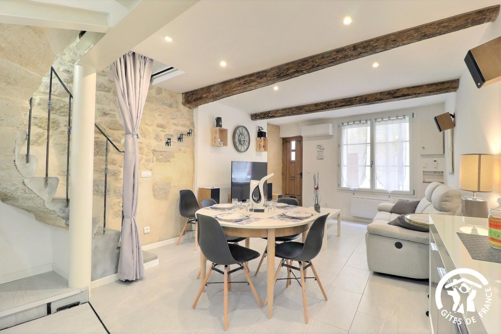 - Séjour avec canapé confortable électrique de relaxation, grande TV écran plat 139cm, chaîne hifi (ampli avec radio / home cinéma). Espace repas avec table à rallonges pouvant accueillir 6 convives. Cuisine équipée d'angle ouverte sur le séjour avec plaque 3 feux vitrocéramique, hotte, lave-vaisselle, réfrigérateur/congélateur américain avec distributeur d'eau et de glaçons, micro-ondes, four et cafetière à dosettes Dolce Gusto. Puits de lumière au bout de la cuisine.