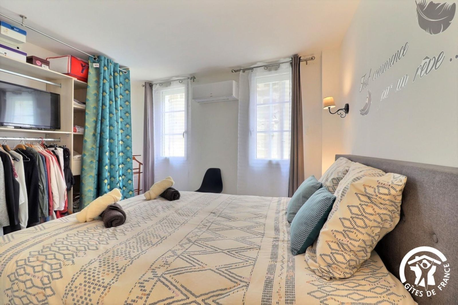 - 1ère chambre avec un lit 2 personnes 160x200cm, grand dressing avec TV écran plat.