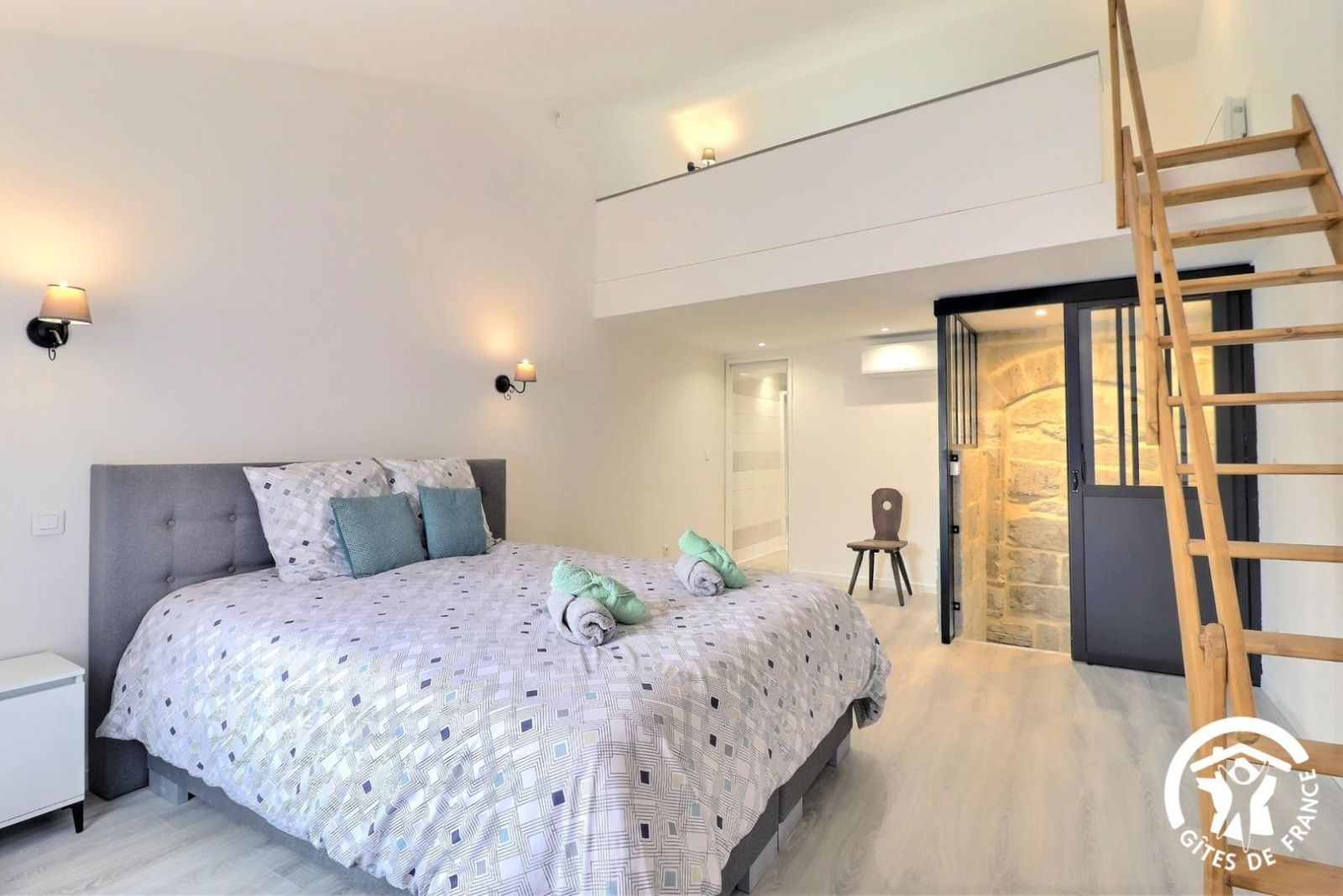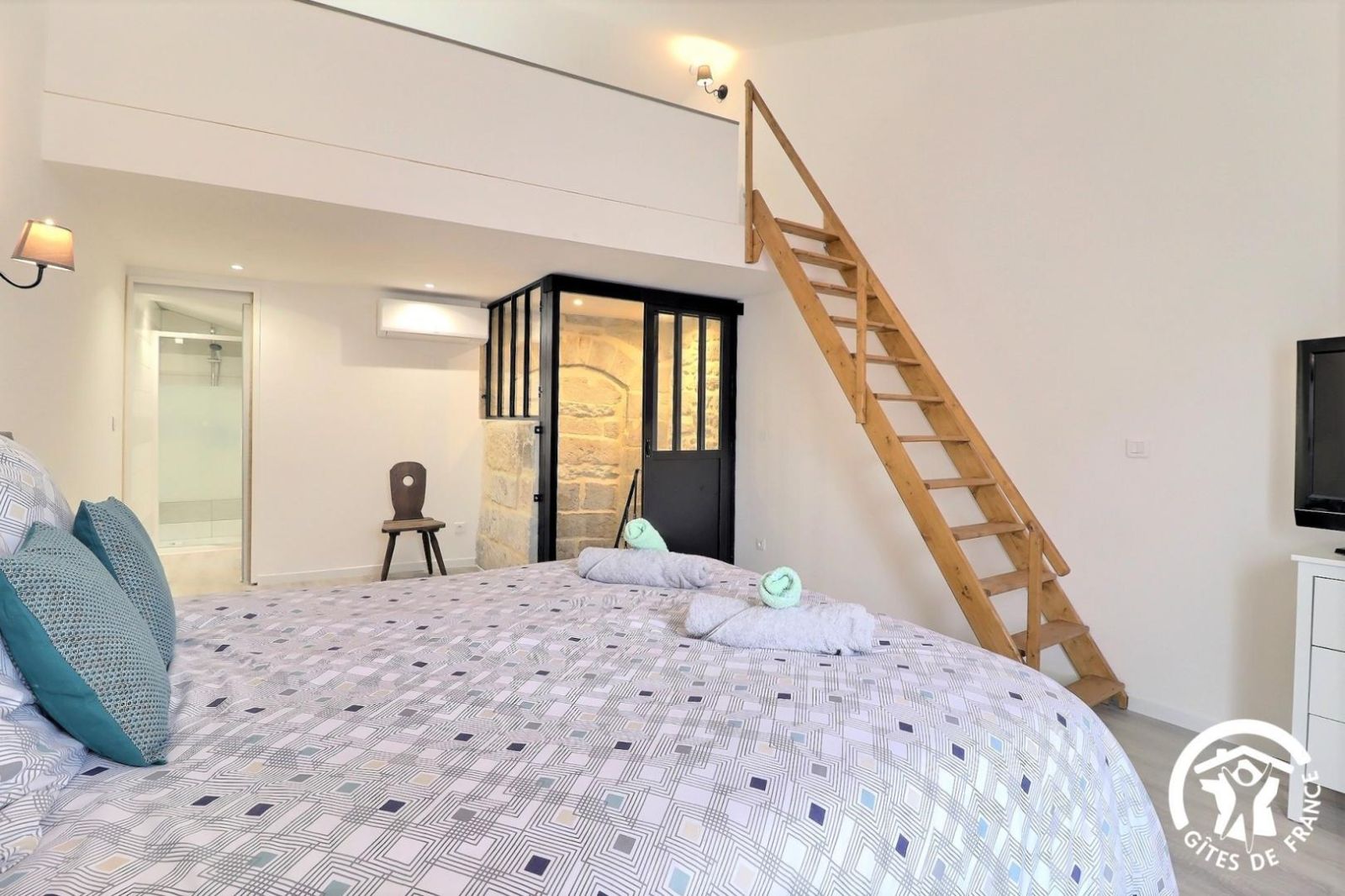 - 2ème chambre avec un lit 2 personnes 160x200cm, TV écran plat, escalier menant à la mezzanine avec un lit 90x190cm surplombant la chambre avec rangements. Vue sur les toits de Barbentane, l'église et les tours du château.