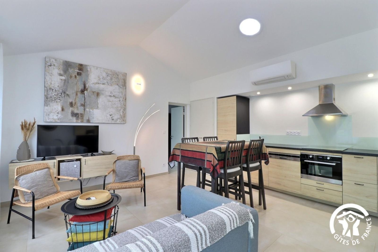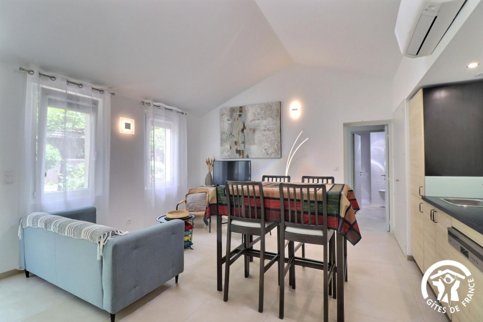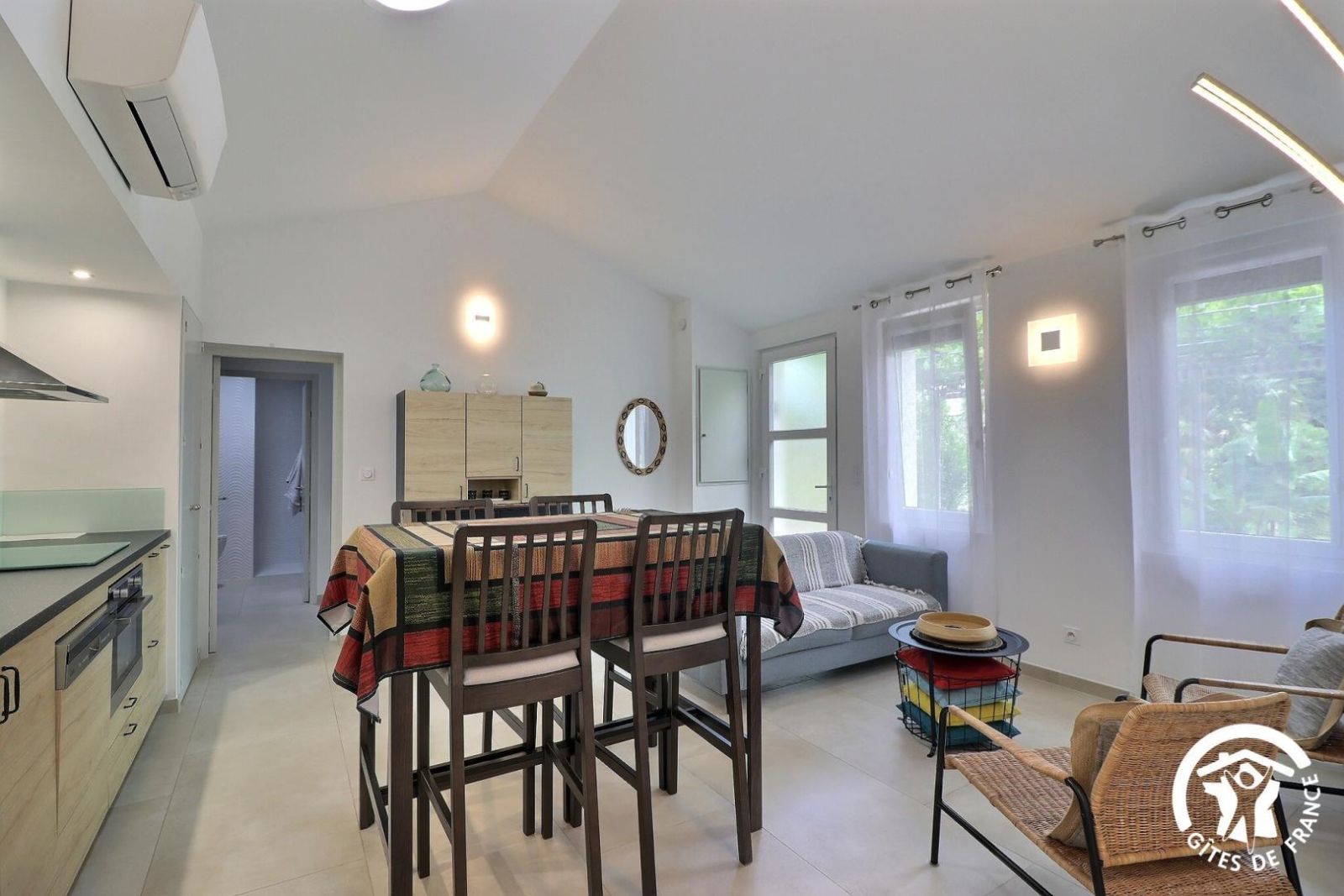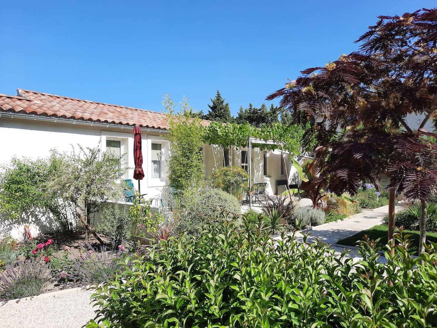 2 chambres, chacune avec 2 lits 80x200cm jumelables en 1 lit 160x200cm et bureau. Sanitaire privatif pour chaque chambre avec puits de lumière, douche à l'italienne, vasque et WC. Terrasse privative de 55m² avec treille, salon de jardin confortable, barbecue. Terrain de pétanque. Jardin privatif d'environ 400 m². Climatisation réversible (incluse). Draps et linge de toilette offerts. Ménage de fin de séjour à la demande. Animaux autorisés sous conditions : 1 petit animal autorisé, ramassage des déjections obligatoire, chiens catégorisés interdits. Chaise haute et lit bébé fournis sur demande. Wifi.