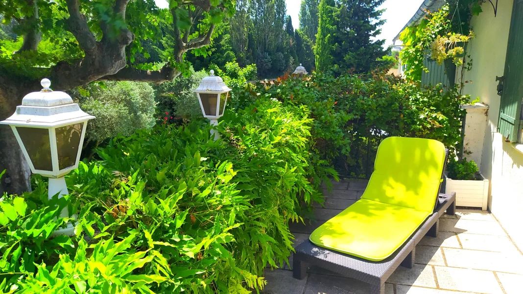 Le gîte des Platanes est situé au 1er étage de la bâtisse, orienté plein Sud, avec grande terrasse privative attenante (2,30mx14,2m) avec salon de jardin et barbecue, habillée de glycine en saison.