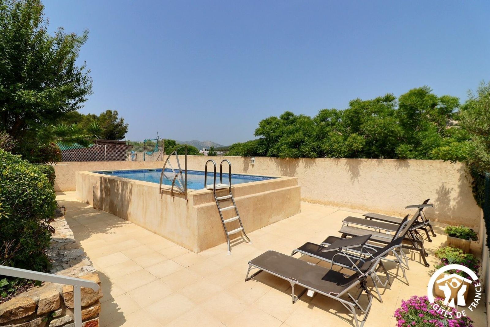 Piscine hors-sol partagée (8x4 m, profondeur 1,20 m), traitée au chlore, accessible tous les jours jusqu’à 21h.