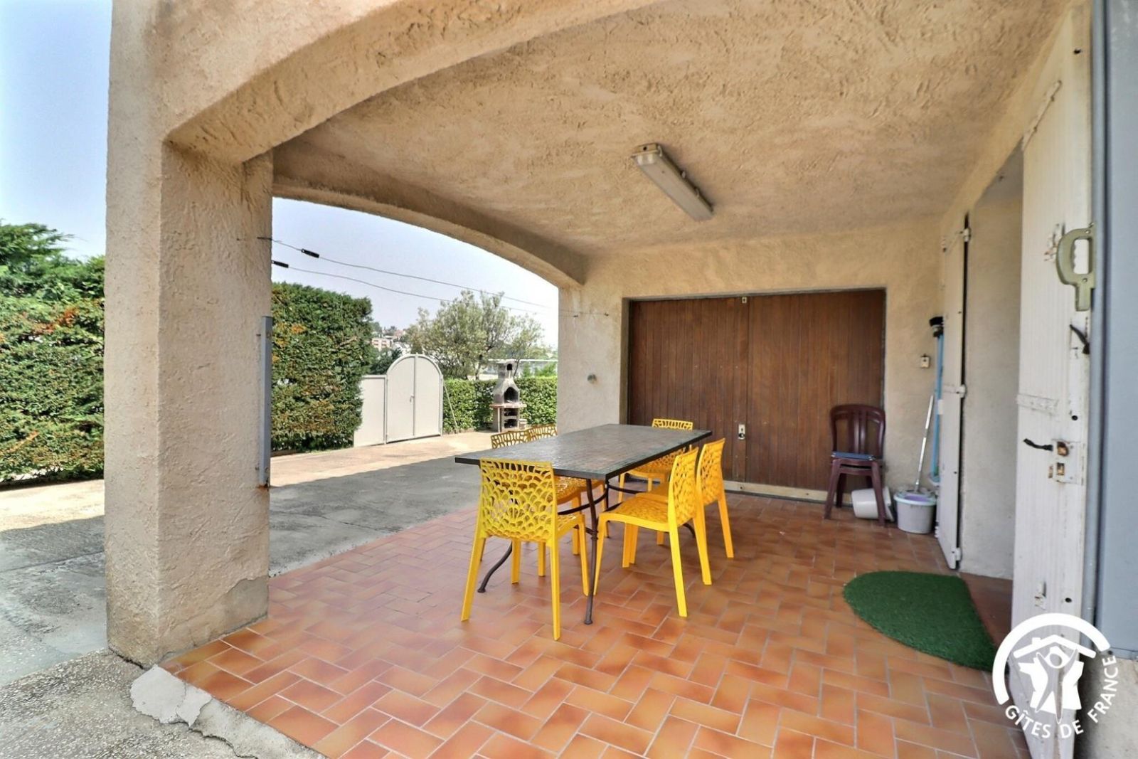Terrasse couverte avec salon de jardin et barbecue maçonné.