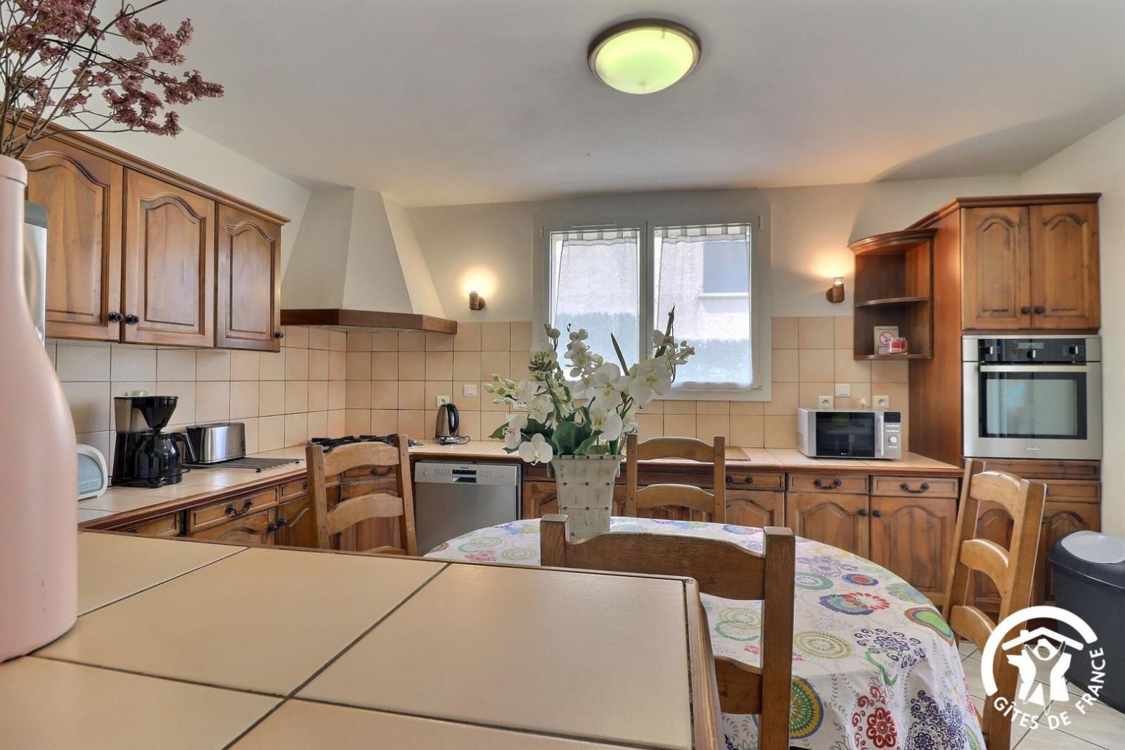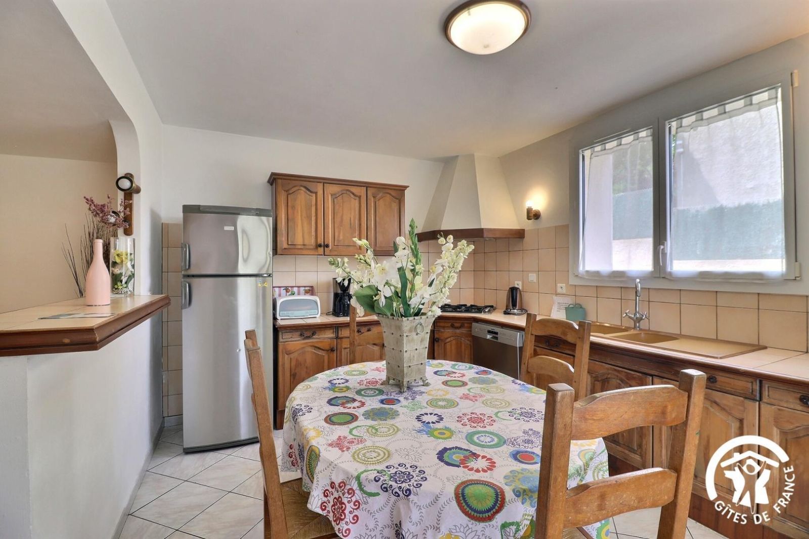 - Cuisine ouverte entièrement équipée : réfrigérateur-congélateur, lave-vaisselle, plaque 4 feux gaz, hotte, four, micro-ondes. Table pour 6 personnes.