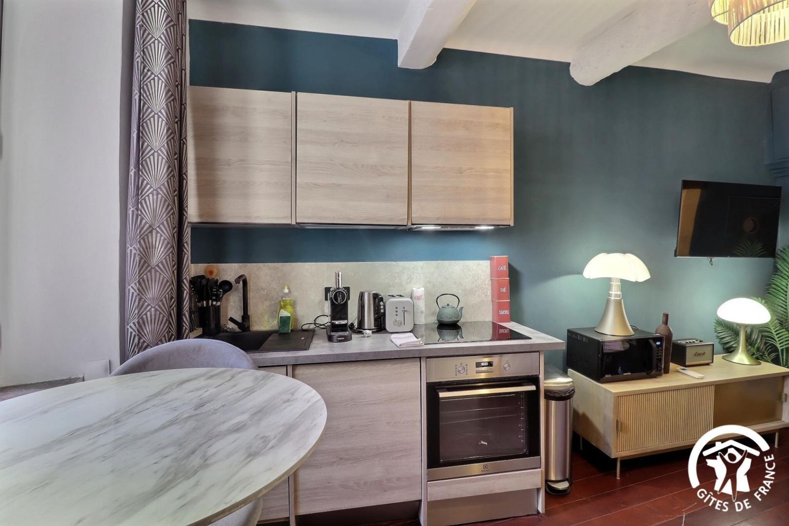- Pièce de vie avec cuisine équipée (réfrigérateur, petit lave-vaisselle, 3 feux induction, combiné four/micro-ondes, table haute et tabourets), coin nuit avec lit gigogne convertible en li 160x200cm, table basse et TV.