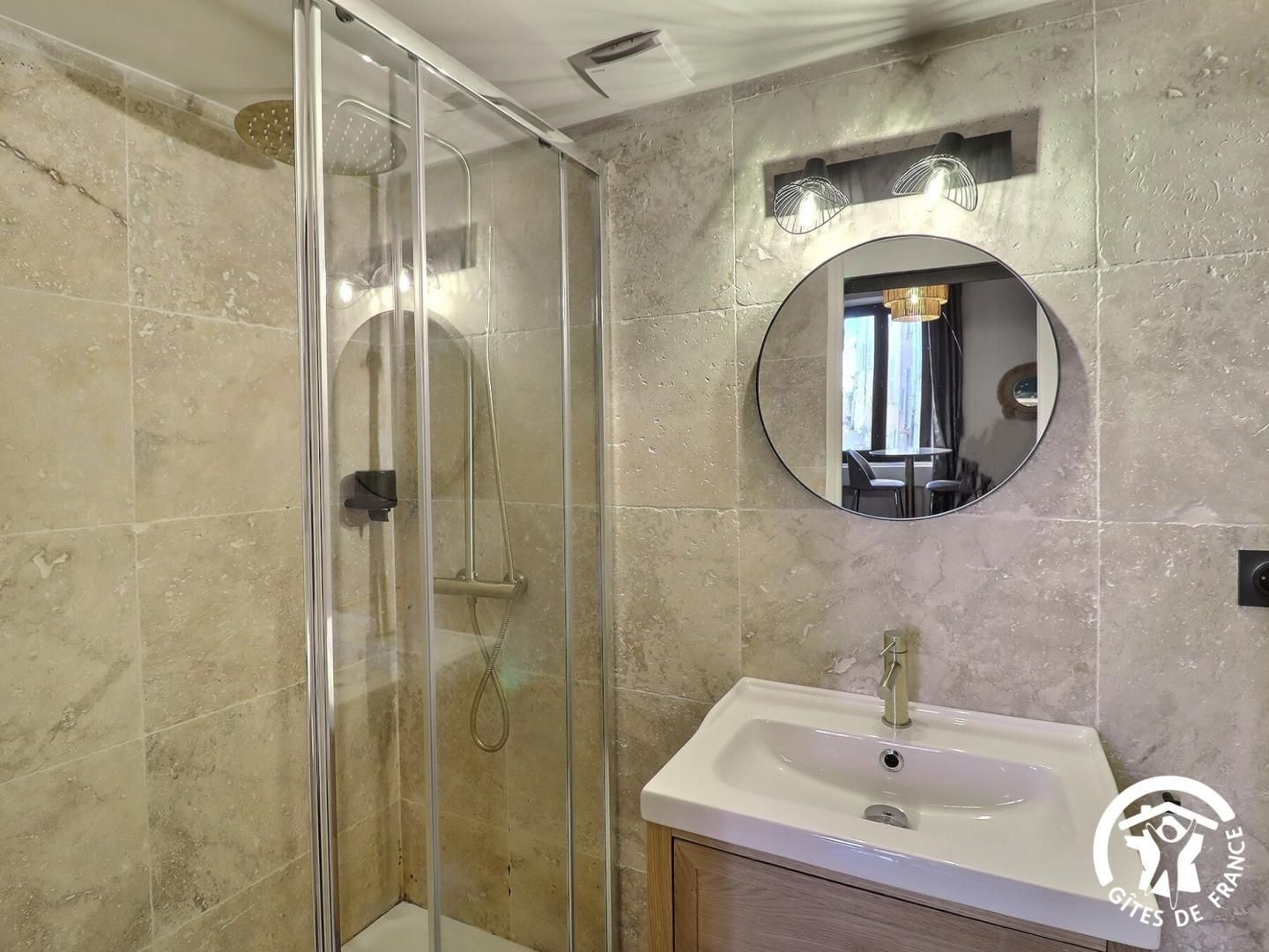 - Salle d'eau avec douche, vasque et WC.