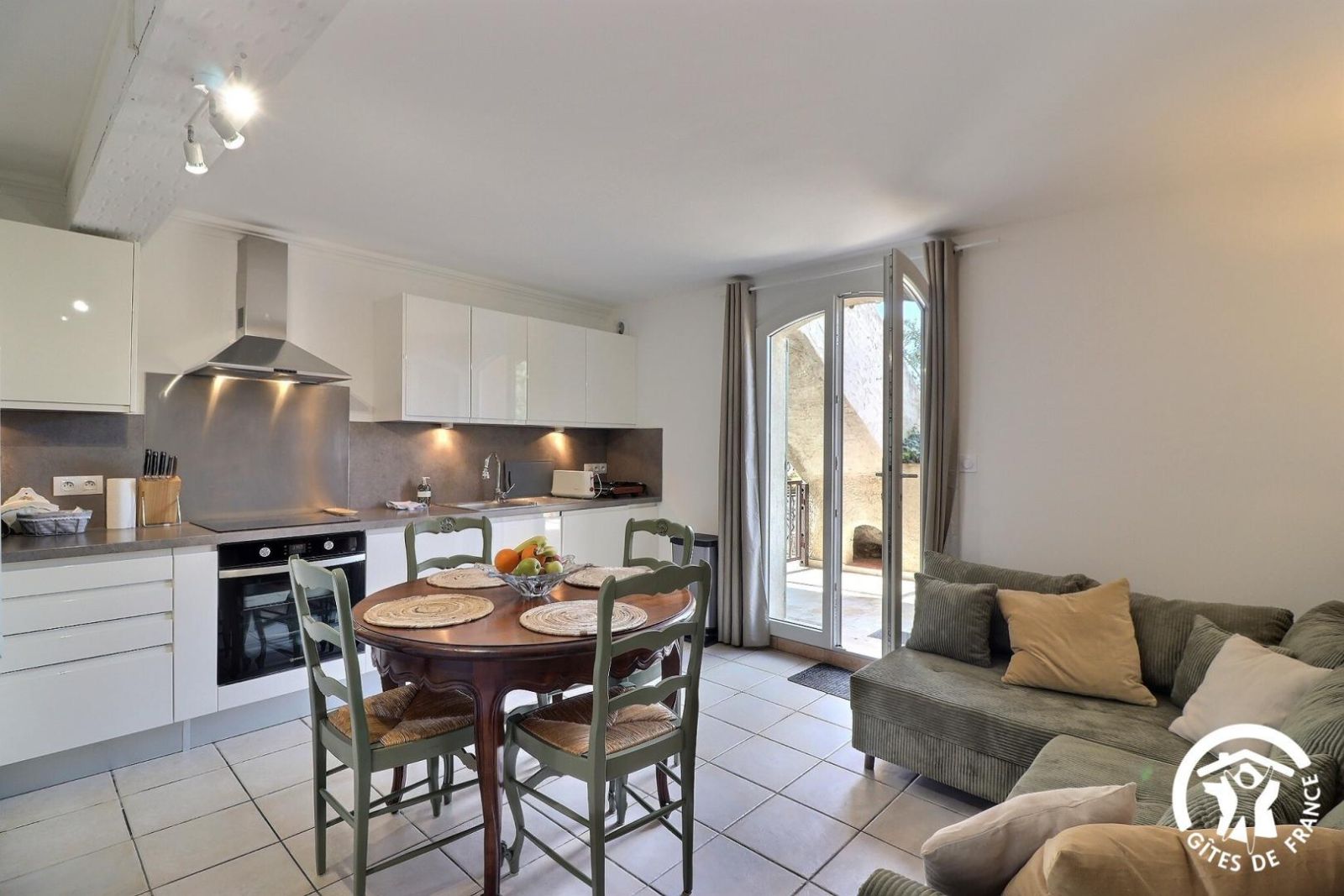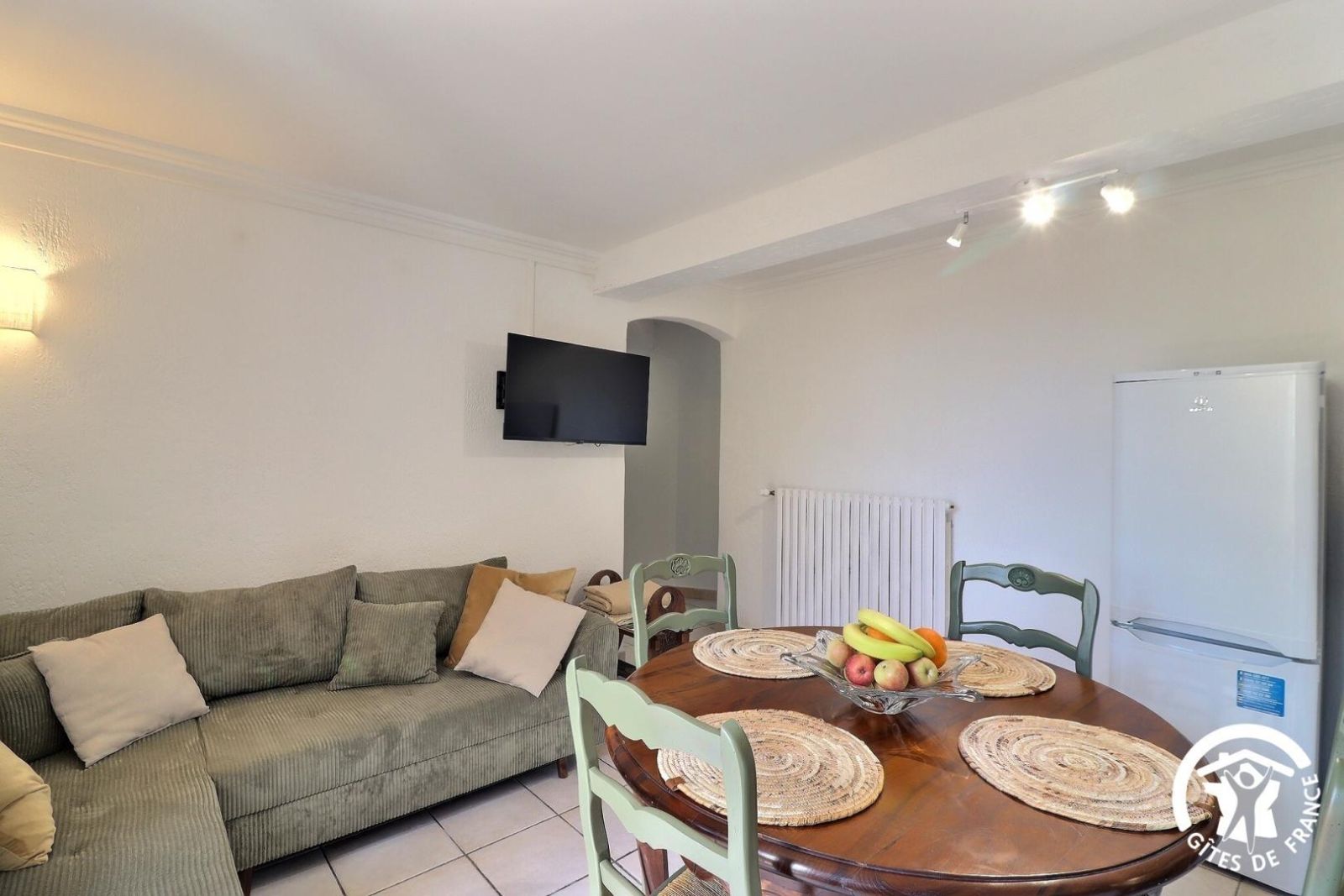 - un séjour coin salon avec canapé d'angle, TV avec bras modulable, cuisine équipée avec machine à laver, lave-vaisselle, réfrigérateur-congélateur, plaque 4 feux vitrocéramique et table avec 4 chaises