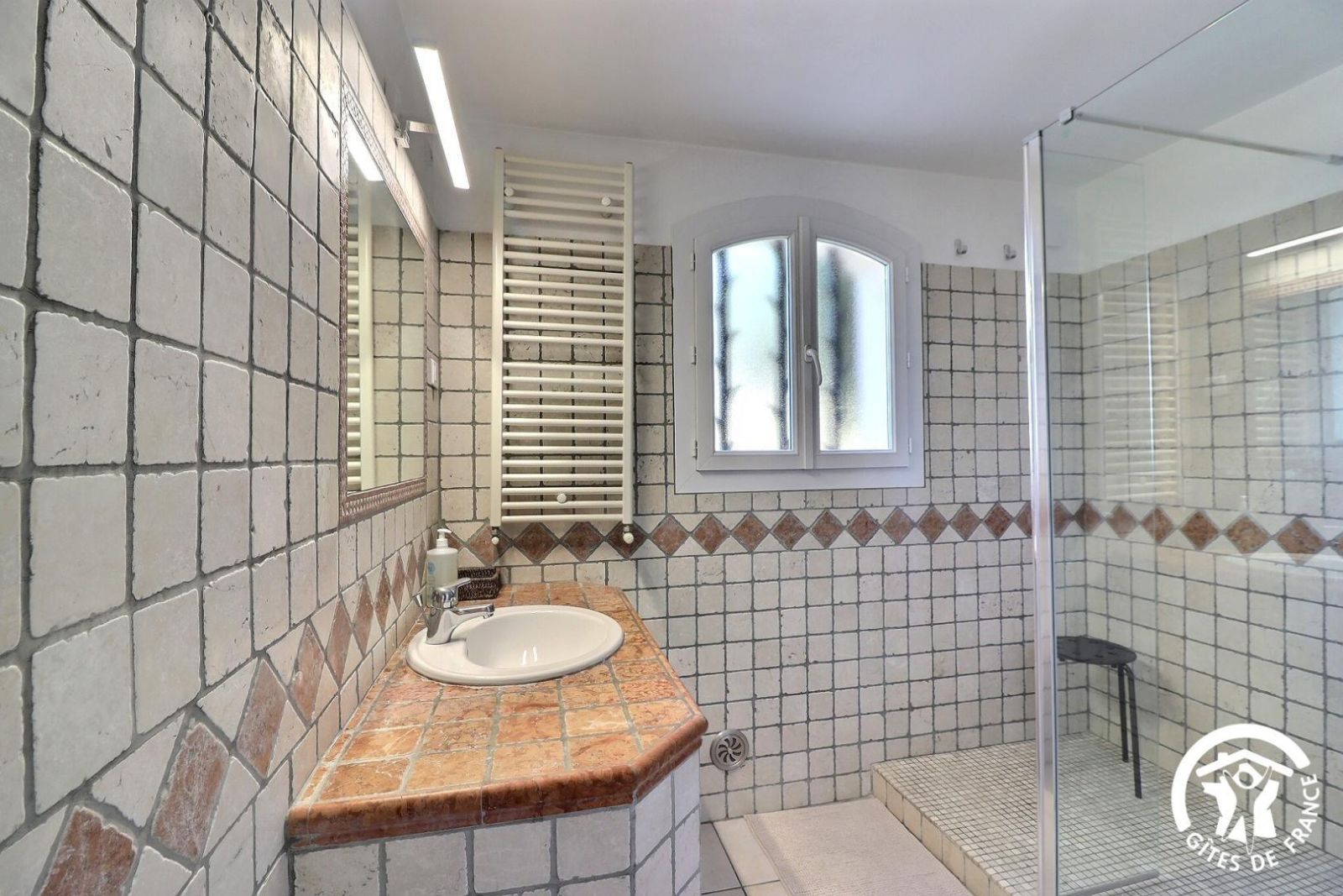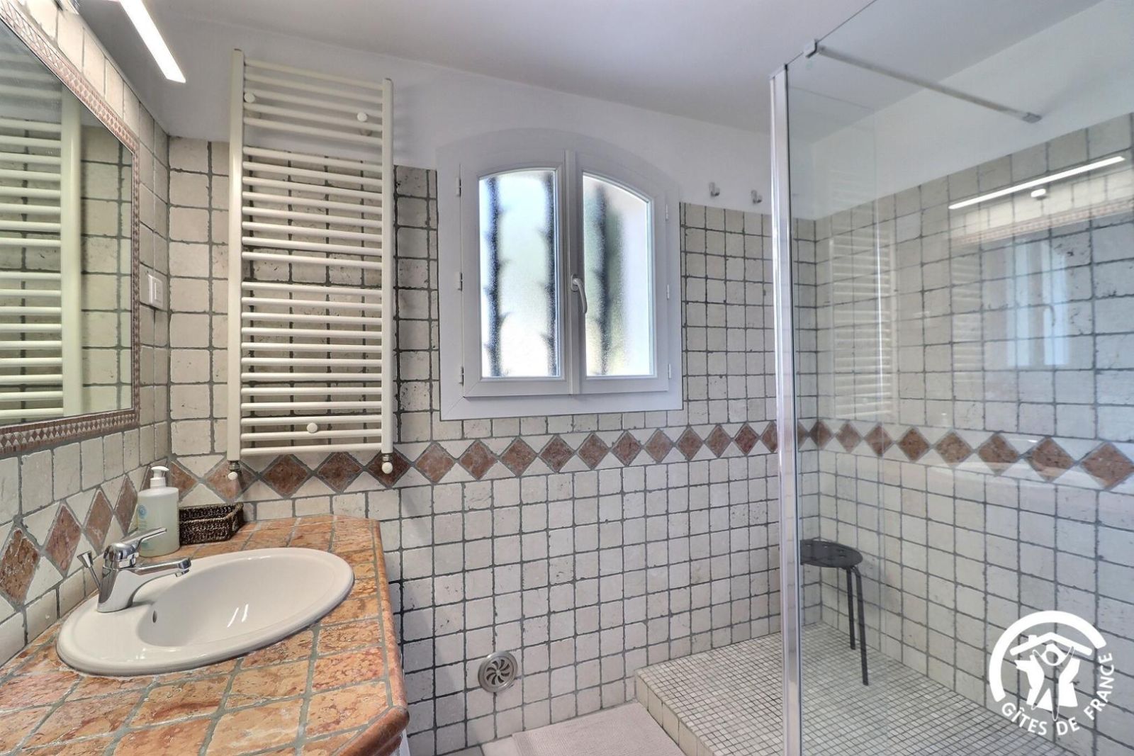 - une salle d'eau avec meuble vasque, douche à l'italienne et sèche-serviette chauffant
