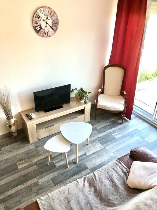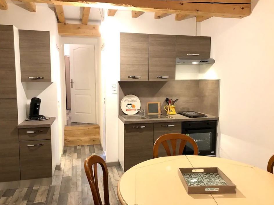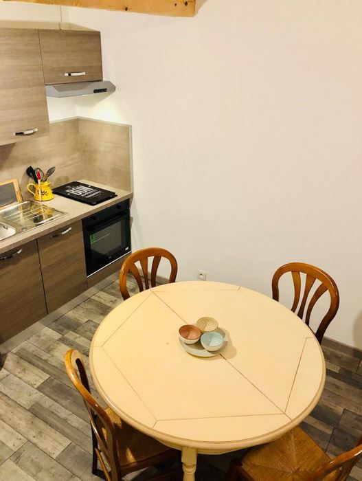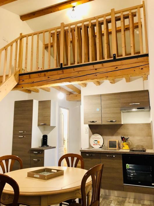 - Pièce de vie avec salon (canapé cuir, fauteuil, TV écran plat connectée avec accès direct à Youtube et Netflix), espace repas pour 4 personnes, bureau, petite cuisine équipée (plaque 2 feux vitrocéramique, four électrique, hotte, réfrigérateur/congélateur, micro-ondes, cafetière à dosettes Senseo et appareil à raclette) et coin nuit en mezzanine de 11 m² avec 2 lits 1 personne 90x190cm. Baie vitrée donnant sur la terrasse.