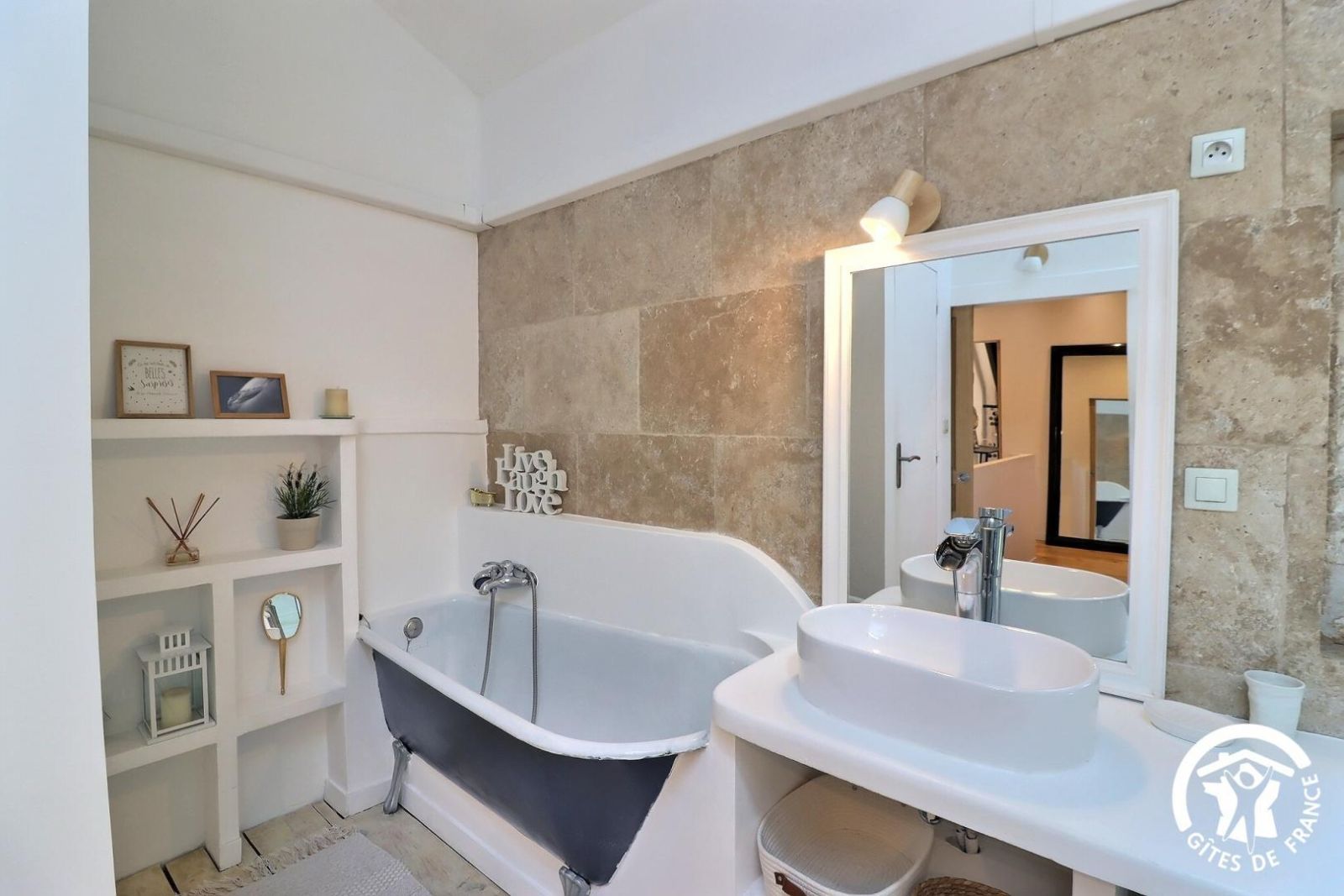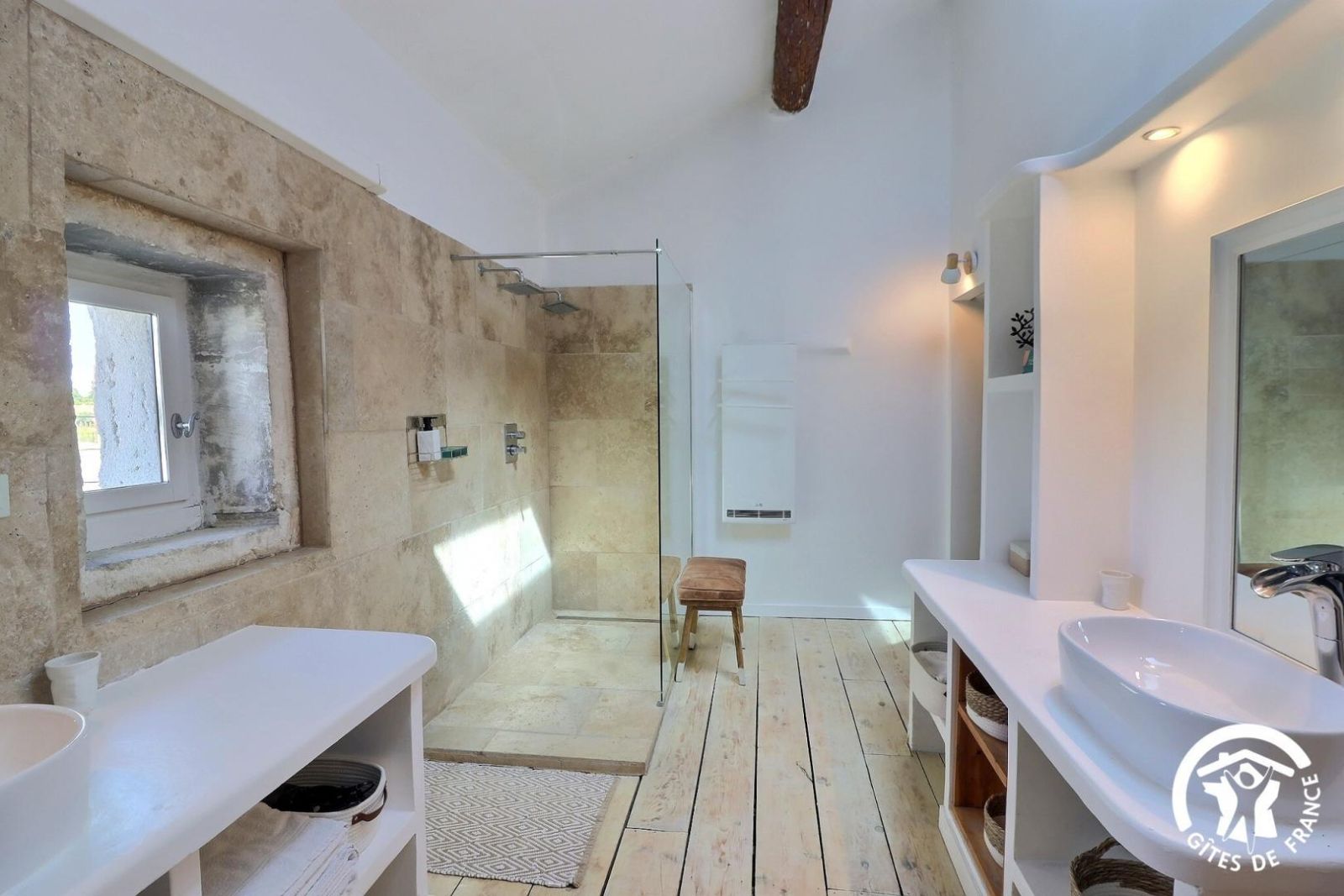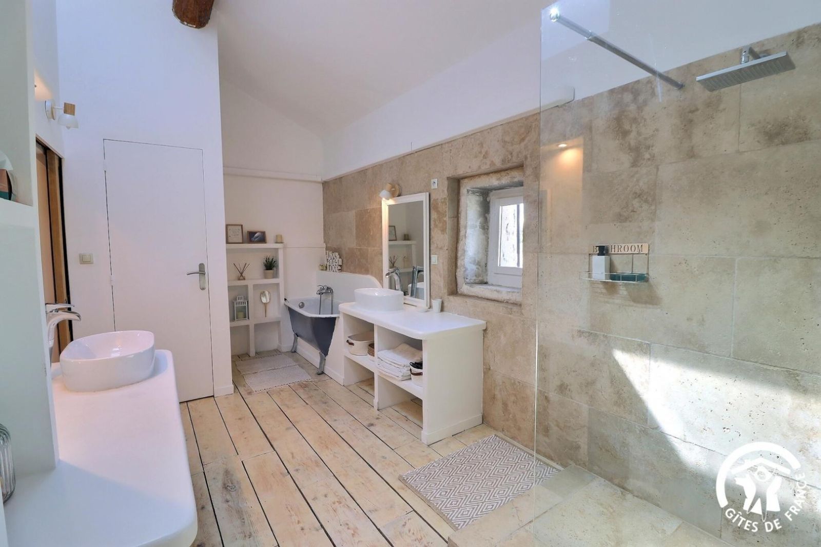 - une salle de bain avec baignoire, douche à l'italienne, deux vasques, sèche-serviettes chauffant