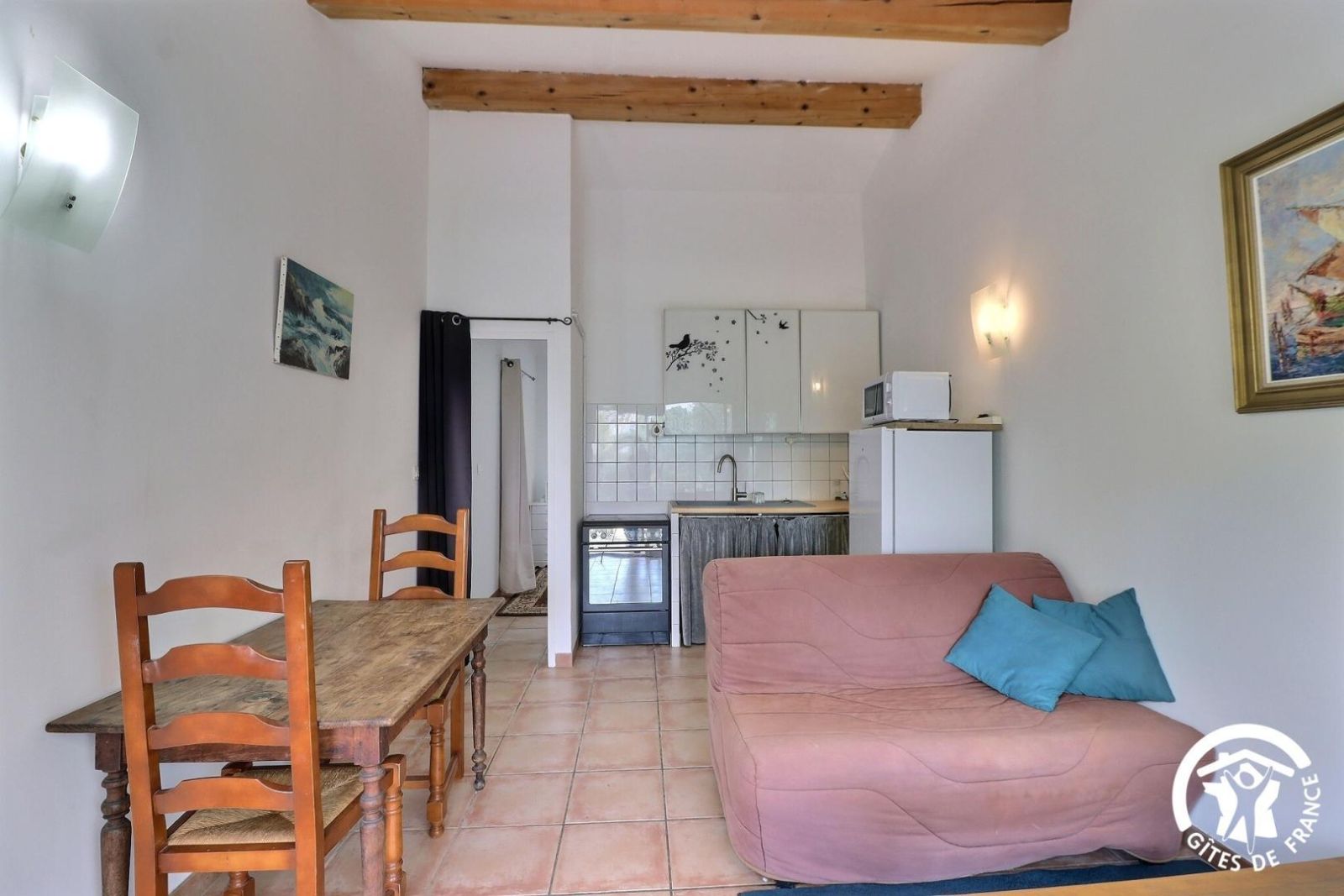 - Salon avec canapé, table basse, coin repas avec table et 2 chaises, petite cuisine ouverte équipée : réfrigérateur/congélateur, micro-ondes, cuisinière avec four et 4 feux vitrocéramique.