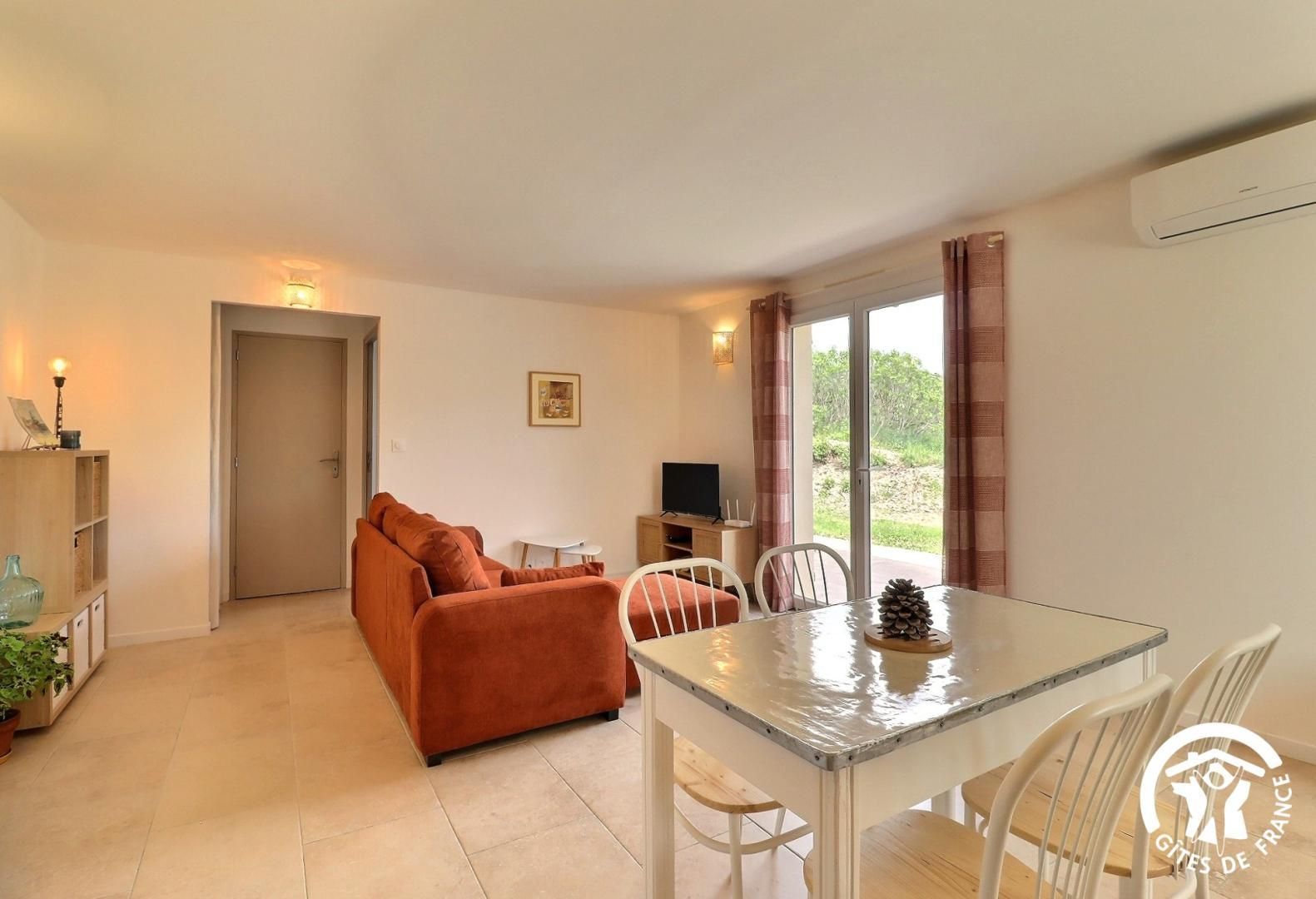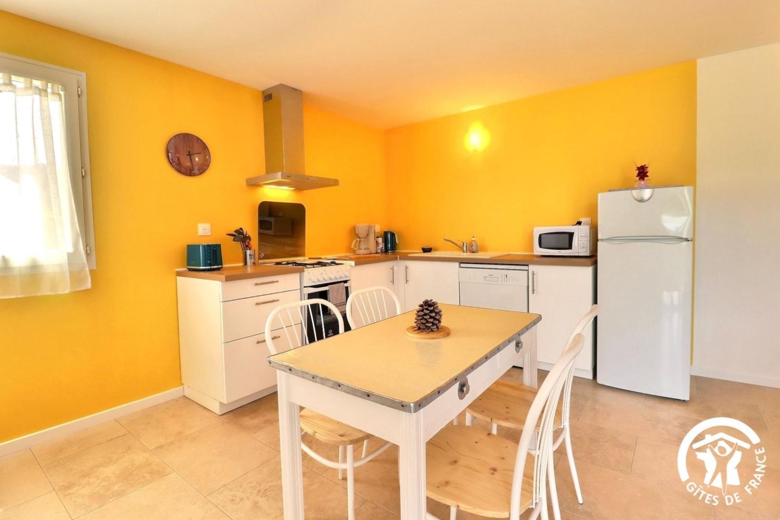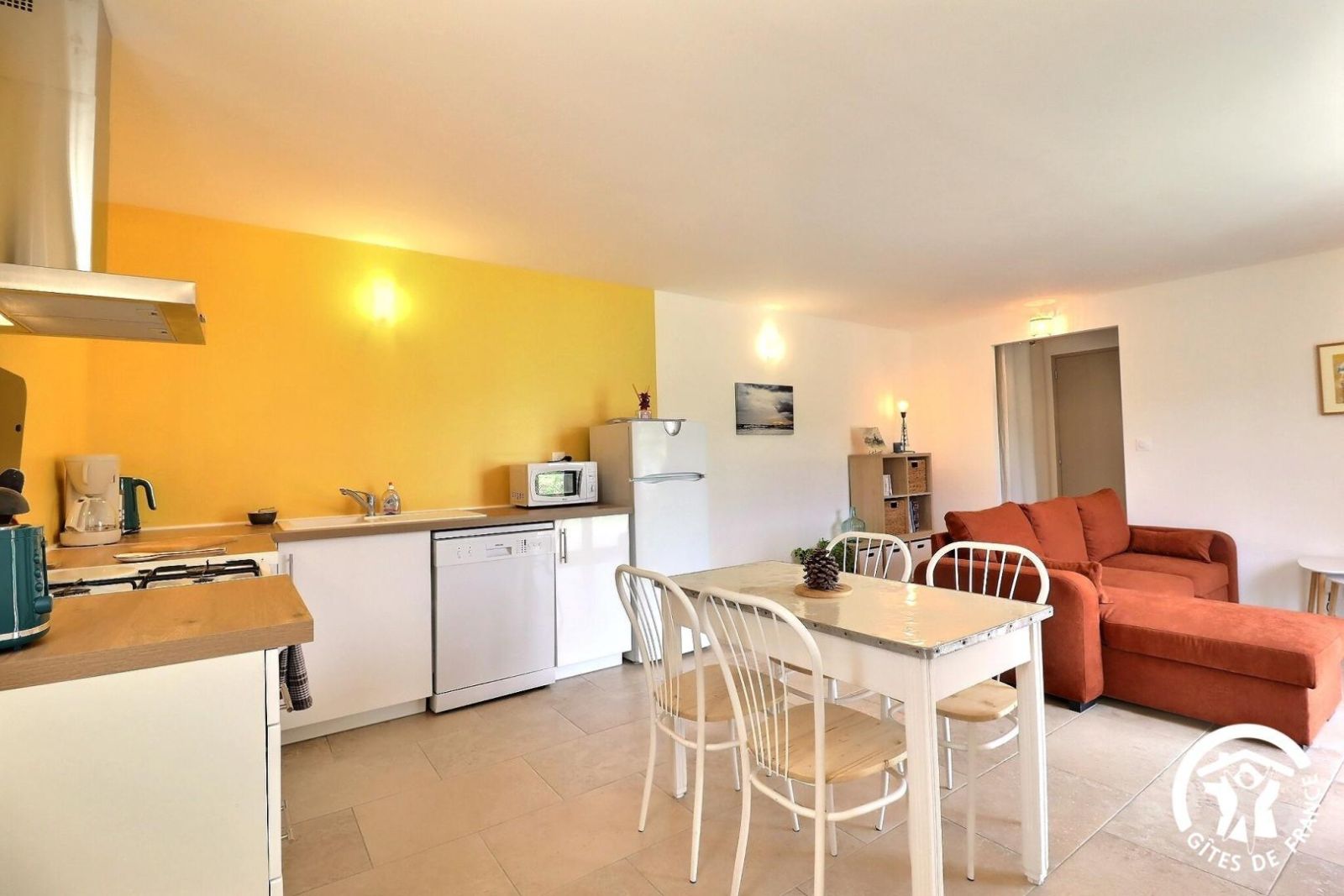- Un séjour composé d'une cuisine équipée avec gazinière 3 feux gaz et 1 électrique, four électrique, hotte, lave-vaisselle, micro-ondes et réfrigérateur/congélateur. Espace repas pour 4 personnes. Coin salon avec canapé d'angle convertible (160x200cm - possibilité de 2 couchages d'appoint supplémentaires), TV écran plat connectée et bibliothèque. Climatisation réversible.