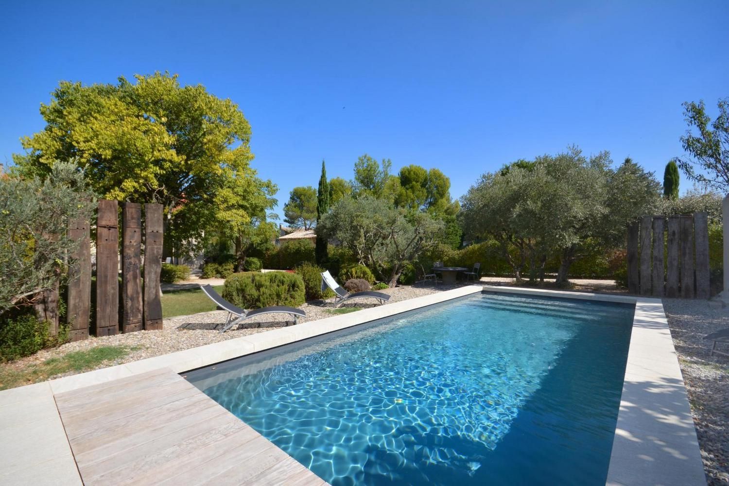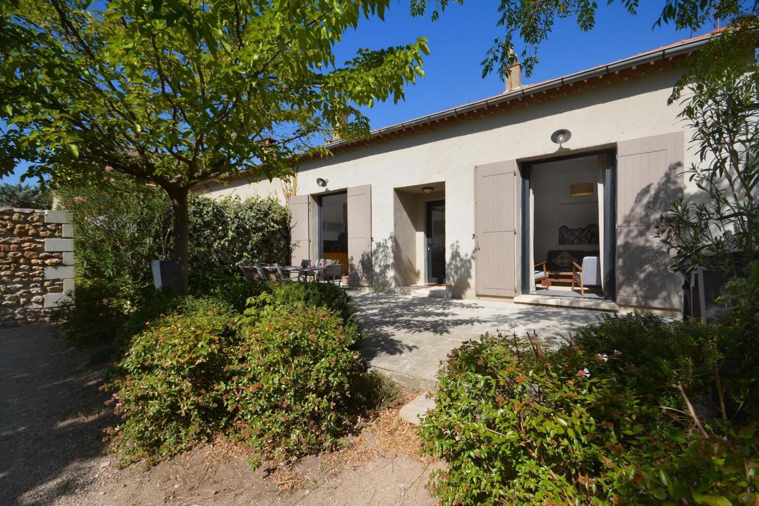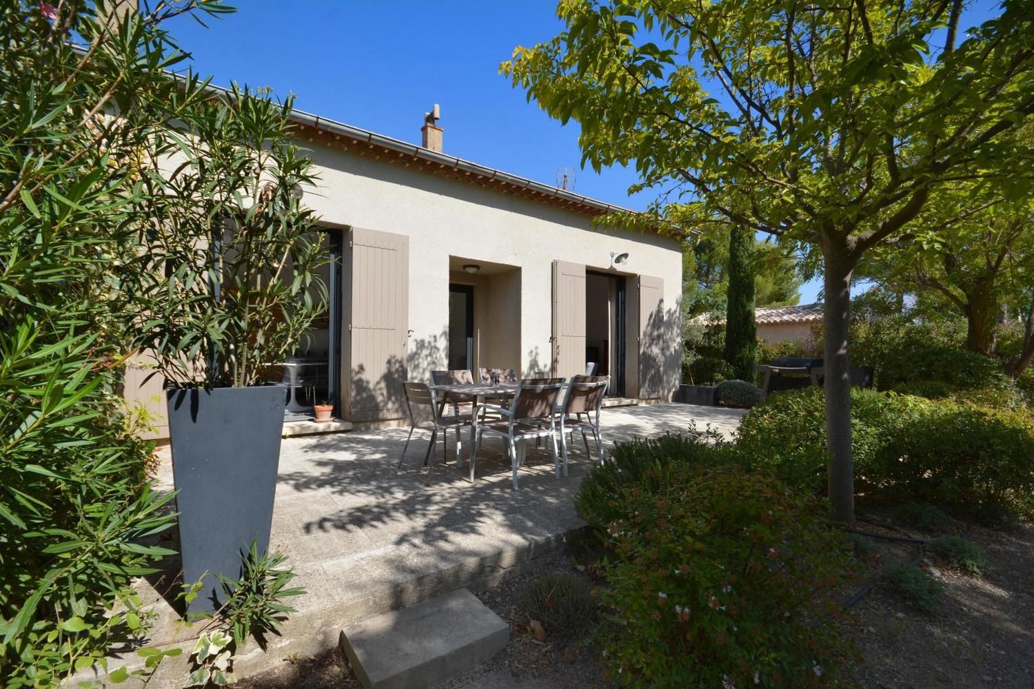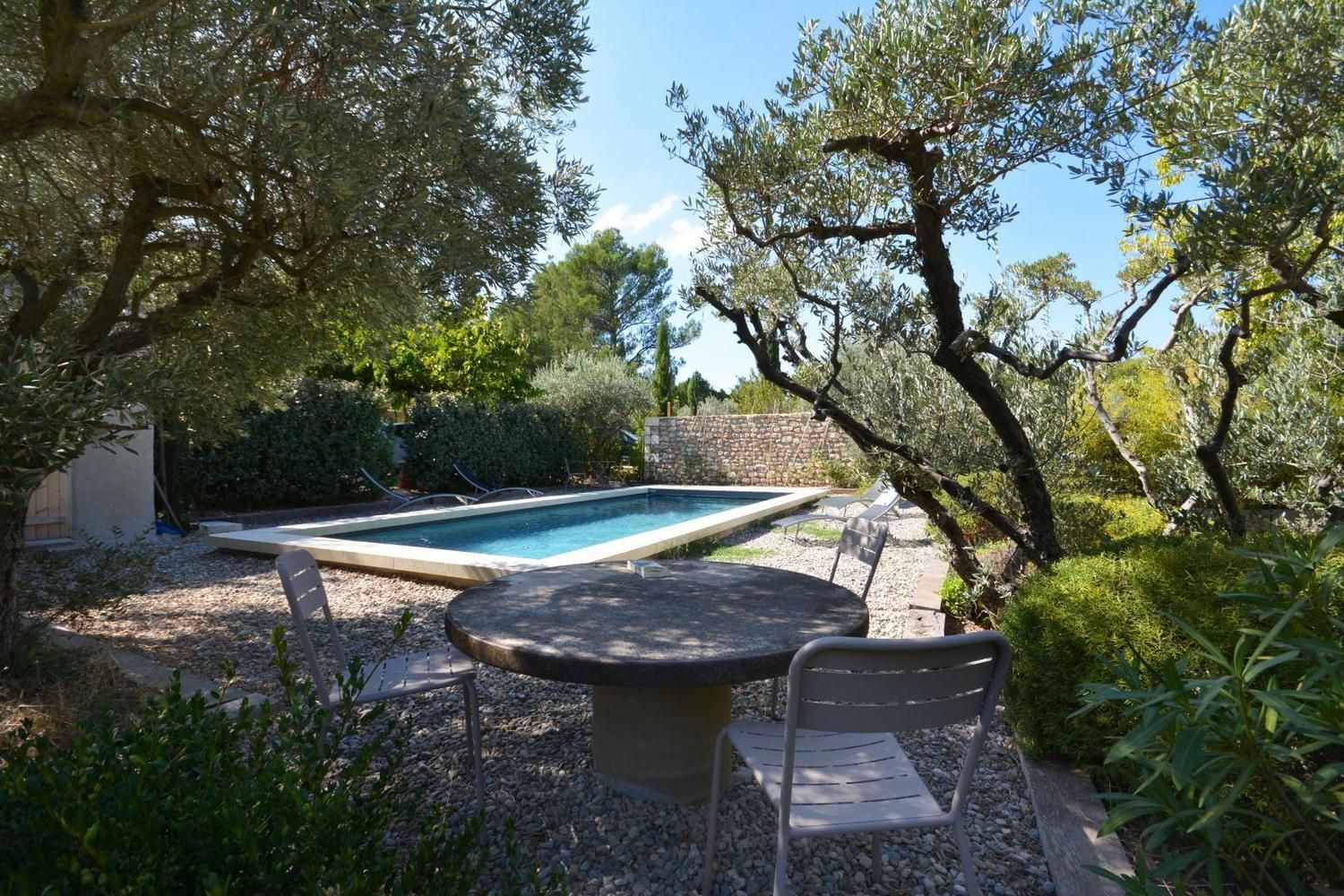 Dans le charmant village d'Eygalières, sur une petite route tranquille qui conduit au pied des sentiers de randonnée dans les Alpilles, très jolie maison semi-indépendante sur terrain commun clos (portail avec télécommande). Piscine privative (4 x 8 m, profondeur de 1.10 m à 1.60 m - volet roulant de sécurité), accessible du 1er mai au 15 octobre. Ce gîte dispose d'un vaste espace extérieur aménagé avec terrasse et salon de jardin, jardin ombragé avec salon détente, piscine privative avec transats. Vous serez au milieu d'oliviers, lauriers roses, arbustes et arbres qui vous prodigueront aux heures les plus chaudes une ombre bienvenue ! Entièrement en rez de chaussée : vaste salon détente avec canapé, télévision écran plat (120cm) donnant sur la terrasse et le jardin. La cuisine, grand espace ouvert vous propose tous les éléments intégrés (lave vaisselle, four, micro ondes, frigo/congélateur, petit électroménager) et le coin repas, avec accès direct également sur la terrasse. Deux chambres, une avec 2 lits 1 personne (90x190) et une avec 1 lit 2 personnes (160x200). Très belle literie, grands placards de rangement. La chambre parentale dispose de sa salle d'eau privative avec accès direct (quelques marches en contrebas) : douche italienne, beau plan vasque, wc. Seconde salle d'eau indépendante avec douche. Wc indépendant. Buanderie avec lave linge, sèche linge, étendage, rangements et petit électroménager. Chauffage électrique (inclus) - Wifi (fibre) - Ménage sur demande - draps et linge fournis - lit et chaise bébé sur demande - barbecue.