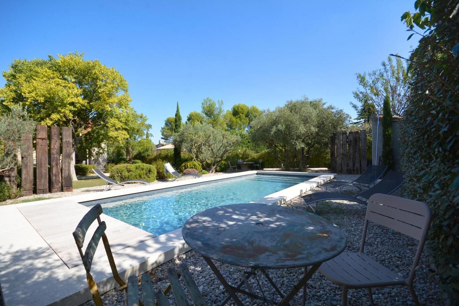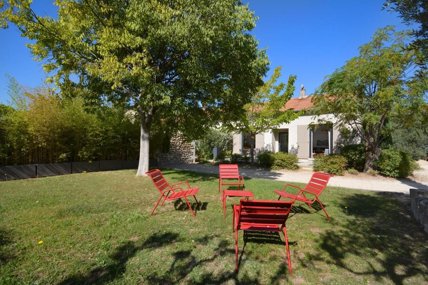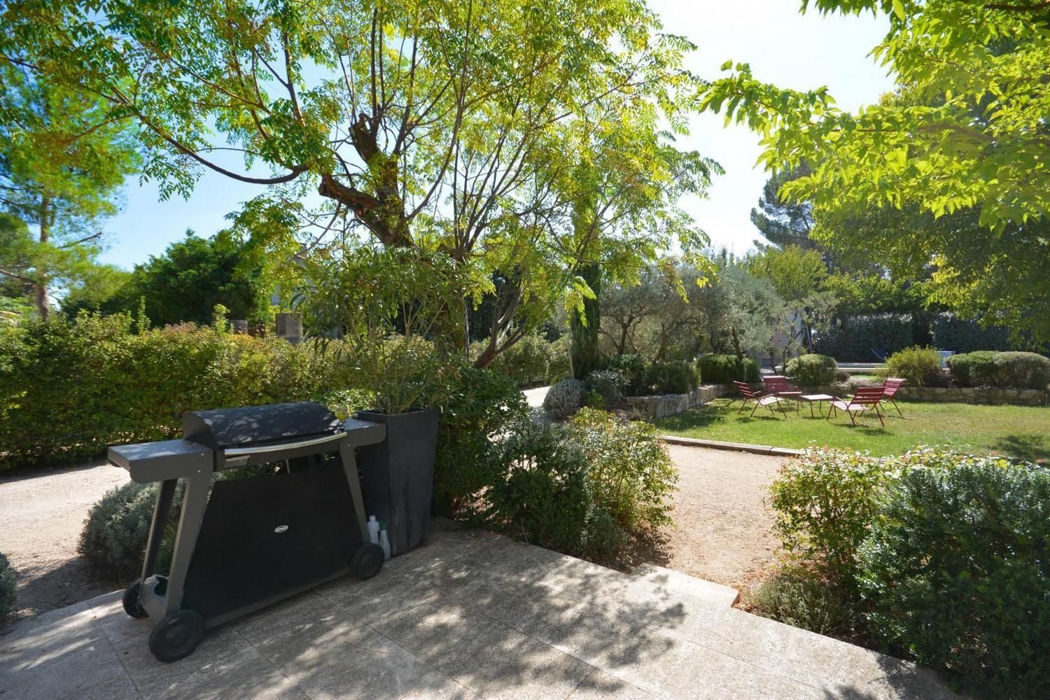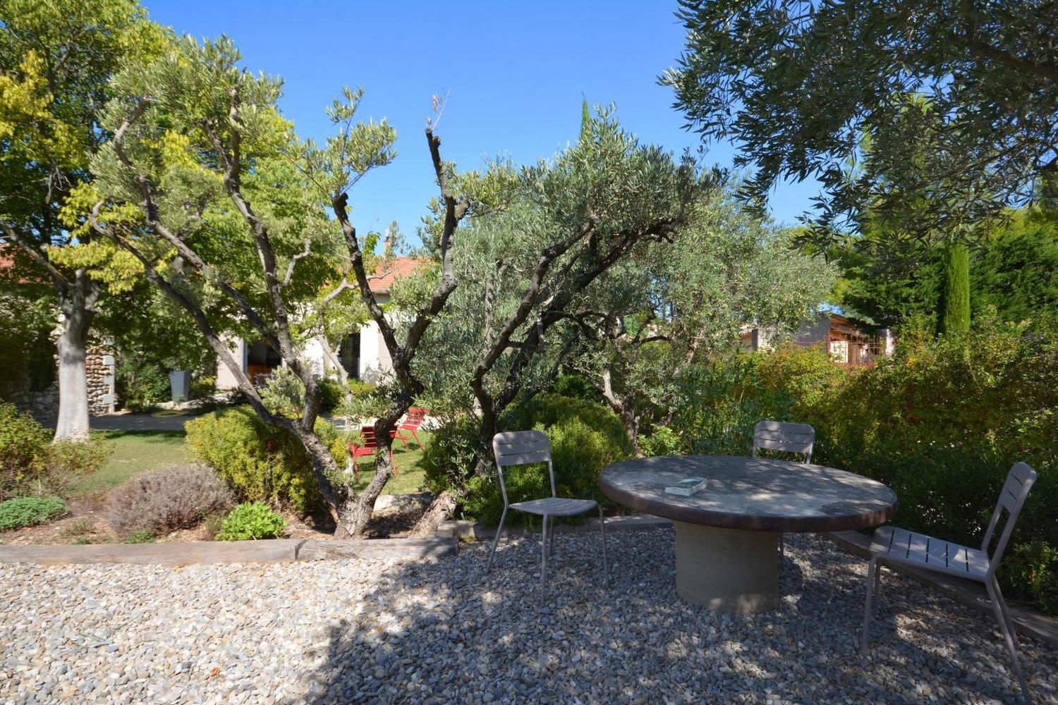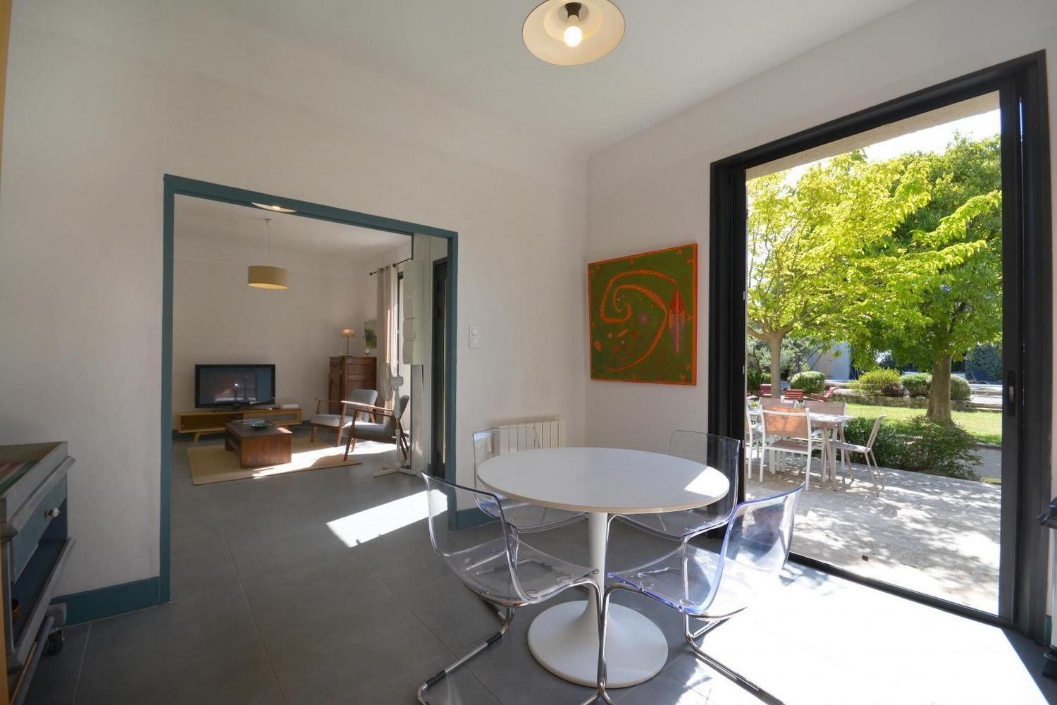 Dans le charmant village d'Eygalières, sur une petite route tranquille qui conduit au pied des sentiers de randonnée dans les Alpilles, très jolie maison semi-indépendante sur terrain commun clos (portail avec télécommande). Piscine privative (4 x 8 m, profondeur de 1.10 m à 1.60 m - volet roulant de sécurité), accessible du 1er mai au 15 octobre. Ce gîte dispose d'un vaste espace extérieur aménagé avec terrasse et salon de jardin, jardin ombragé avec salon détente, piscine privative avec transats. Vous serez au milieu d'oliviers, lauriers roses, arbustes et arbres qui vous prodigueront aux heures les plus chaudes une ombre bienvenue ! Entièrement en rez de chaussée : vaste salon détente avec canapé, télévision écran plat (120cm) donnant sur la terrasse et le jardin. La cuisine, grand espace ouvert vous propose tous les éléments intégrés (lave vaisselle, four, micro ondes, frigo/congélateur, petit électroménager) et le coin repas, avec accès direct également sur la terrasse. Deux chambres, une avec 2 lits 1 personne (90x190) et une avec 1 lit 2 personnes (160x200). Très belle literie, grands placards de rangement. La chambre parentale dispose de sa salle d'eau privative avec accès direct (quelques marches en contrebas) : douche italienne, beau plan vasque, wc. Seconde salle d'eau indépendante avec douche. Wc indépendant. Buanderie avec lave linge, sèche linge, étendage, rangements et petit électroménager. Chauffage électrique (inclus) - Wifi (fibre) - Ménage sur demande - draps et linge fournis - lit et chaise bébé sur demande - barbecue.