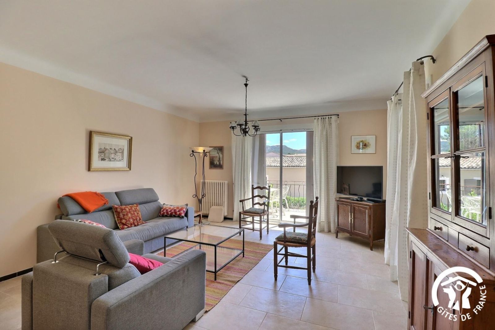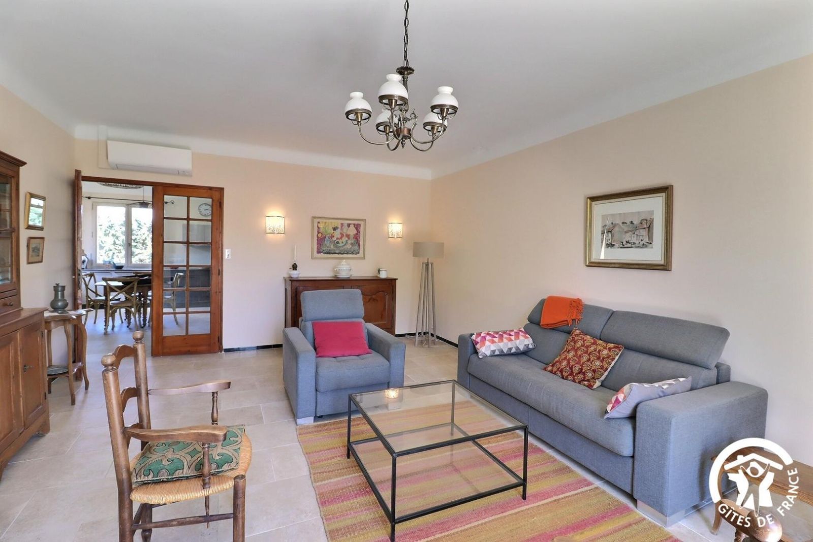 - Un salon avec canapé, fauteuils, TV et lecteur DVD, climatisation