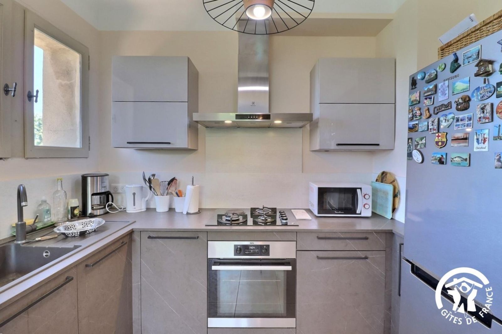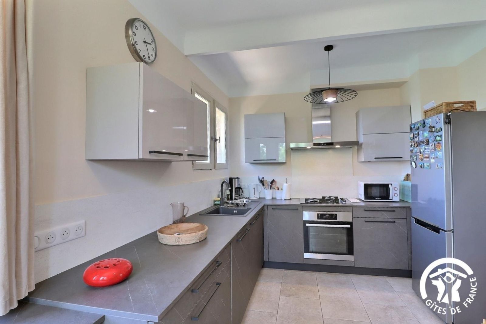 - Une cuisine/Salle à manger avec une cuisine équipée (lave-vaisselle, four, micro-onde, 3 feux gaz et 1 électrique, cafetière à filtre et à dosettes), une table avec 4 chaises et une TV