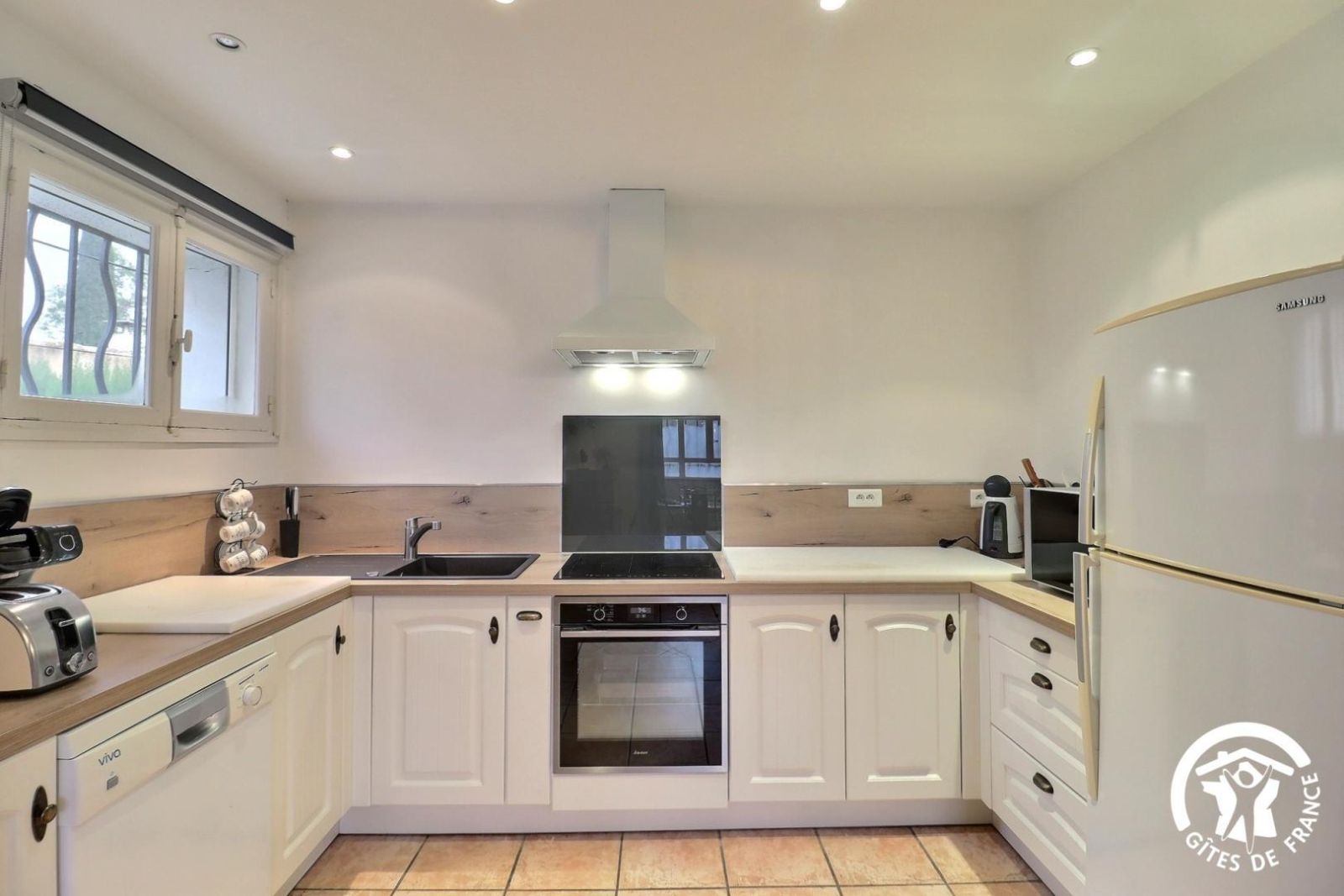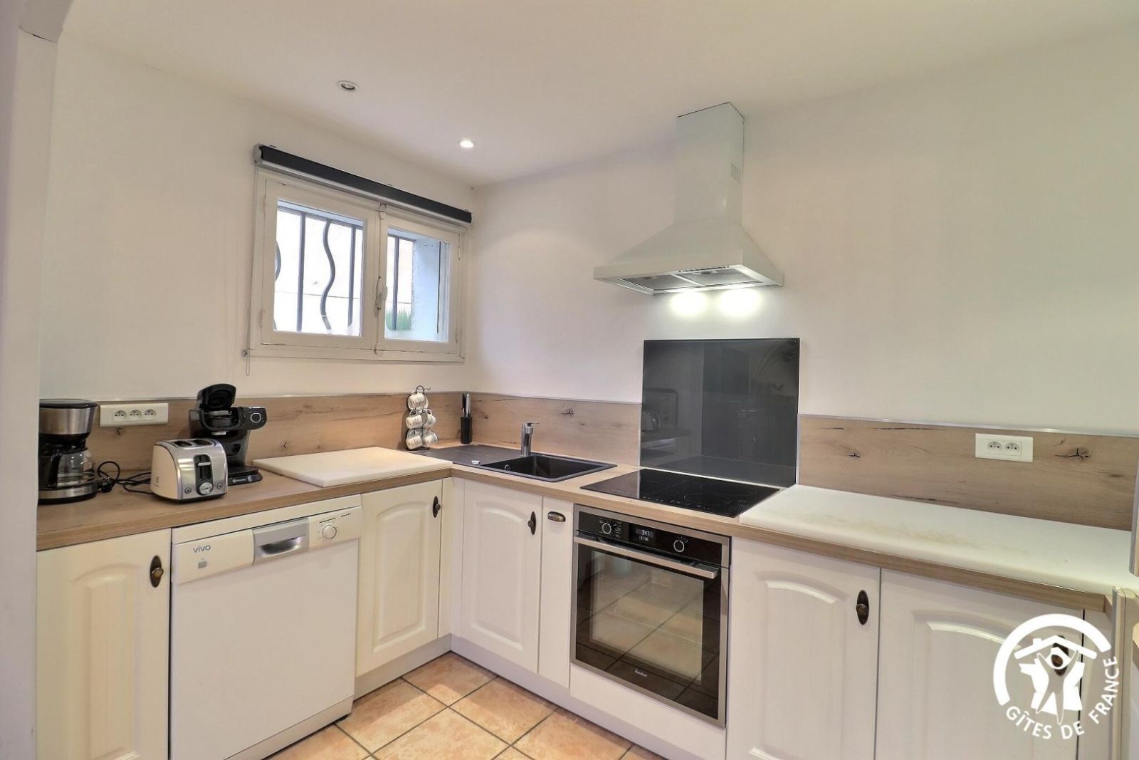 Gîte mitoyen, équipé et décoré avec beaucoup de goût dans un mas du XIXème siècle bénéficiant d'un immense jardin commun clos, fleuri et arboré. Sa situation aux abords du village propose les commodités de première nécessité. Piscine commune du 01/05 au 15/09. Au 1er étage, accès par escalier extérieur. Petite terrasse couverte de 10 m² avec salon de jardin. Hall d'entrée. Séjour/cuisine avec TV, lecteur DVD, chaîne hi-fi. Une première grande chambre de 20 m² avec 1 lit 2 personnes en 160x200 cm. Une seconde chambre avec 2 lits 1 personne en 90x190 cm jumelables. Salle de bains, WC non séparés. Chauffage central au fioul inclus. Électricité en supplément (au delà des56 kwh/semaine). Cheminée insert (bois fourni). Jardin commun de 4500 m². Parking voiture dans la propriété close. Draps et linge de toilette en location.